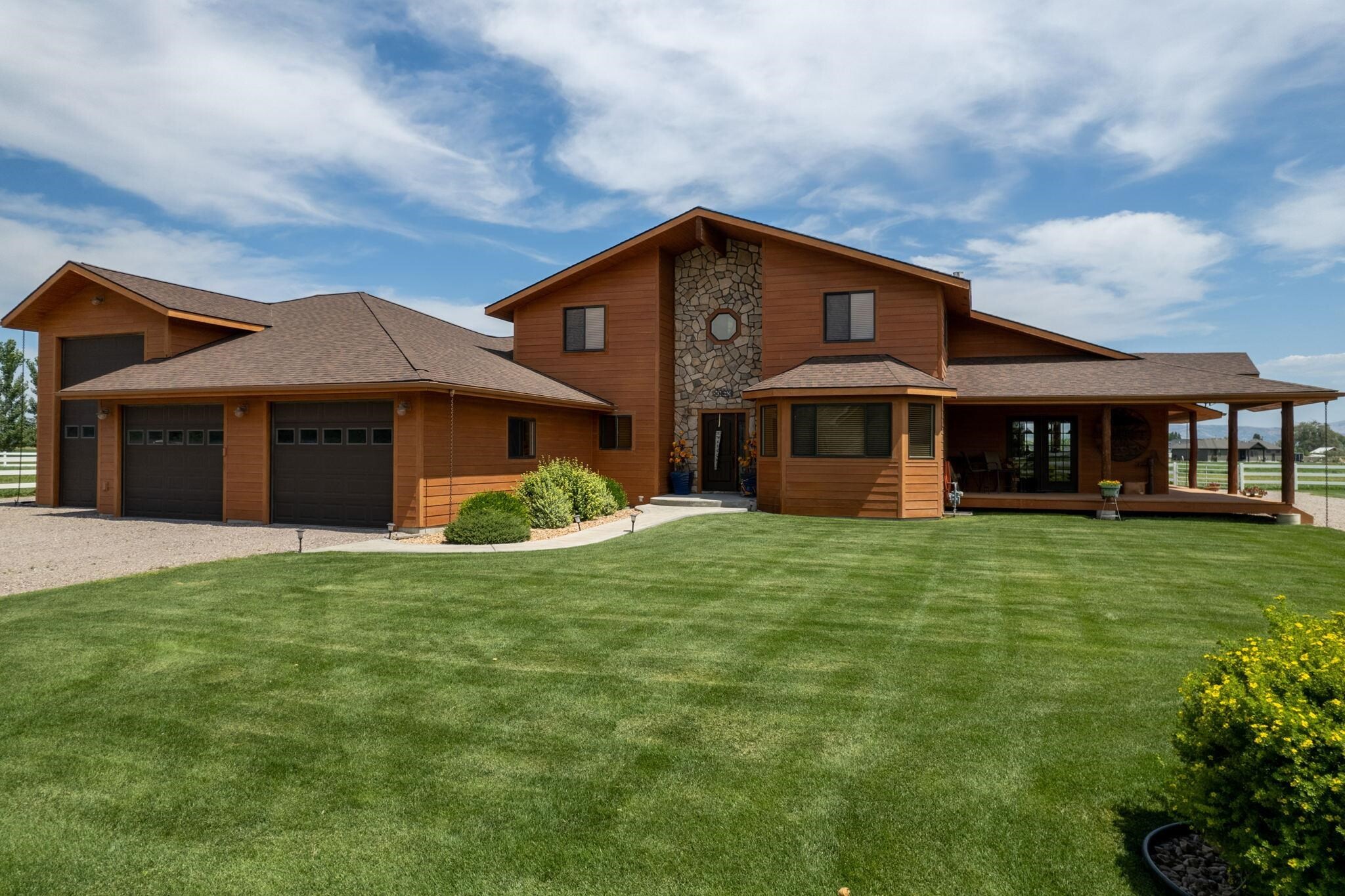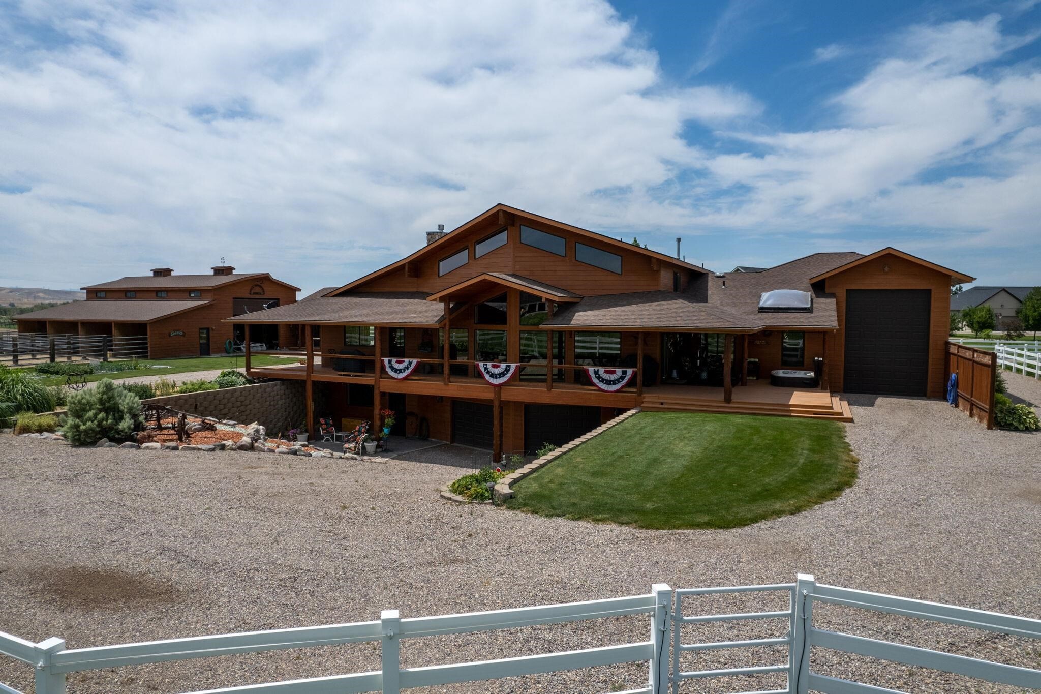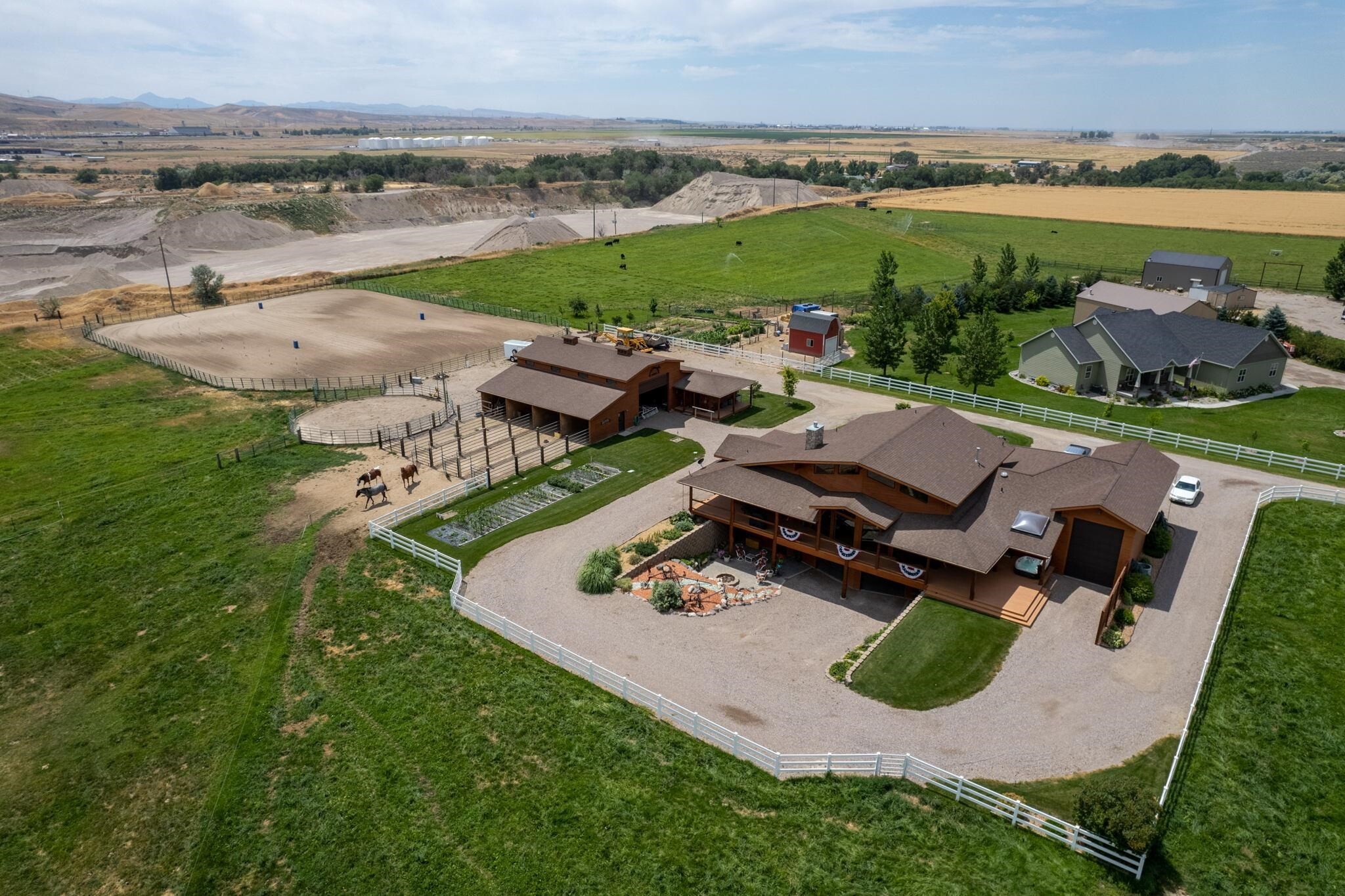 Horse property with luxury and efficiency in mind. Custom and rustic log home with passive-solar design. Open floor plan includes 21â vaulted ceiling in great room/game room. Main floor primary suite. 1400 sf covered deck. Ground-level attached garage boasts 14â drive-thru door RV storage. Wrap around drive lends access to a 1450 sf lower-level garage. Barn is 3,170 sf with 192 sf finished, climate controlled tack room with hot water, washer/dryer, & deep sink. 4 12 x 12â horse stalls each with 40â runs with automatic waterers. Barn includes 204 sf insulated shop w/50 amp welding circuit. Full-size riding arena w/dust control sprinklers & 50â round pen. Irrigation water rights. 3.5 acre pasture w/automated underground sprinkler system. Copy and paste link. https://www.aryeo.com/v2/896fbd3c-e643-4615-bd4b-6503163d9d77/videos/101242