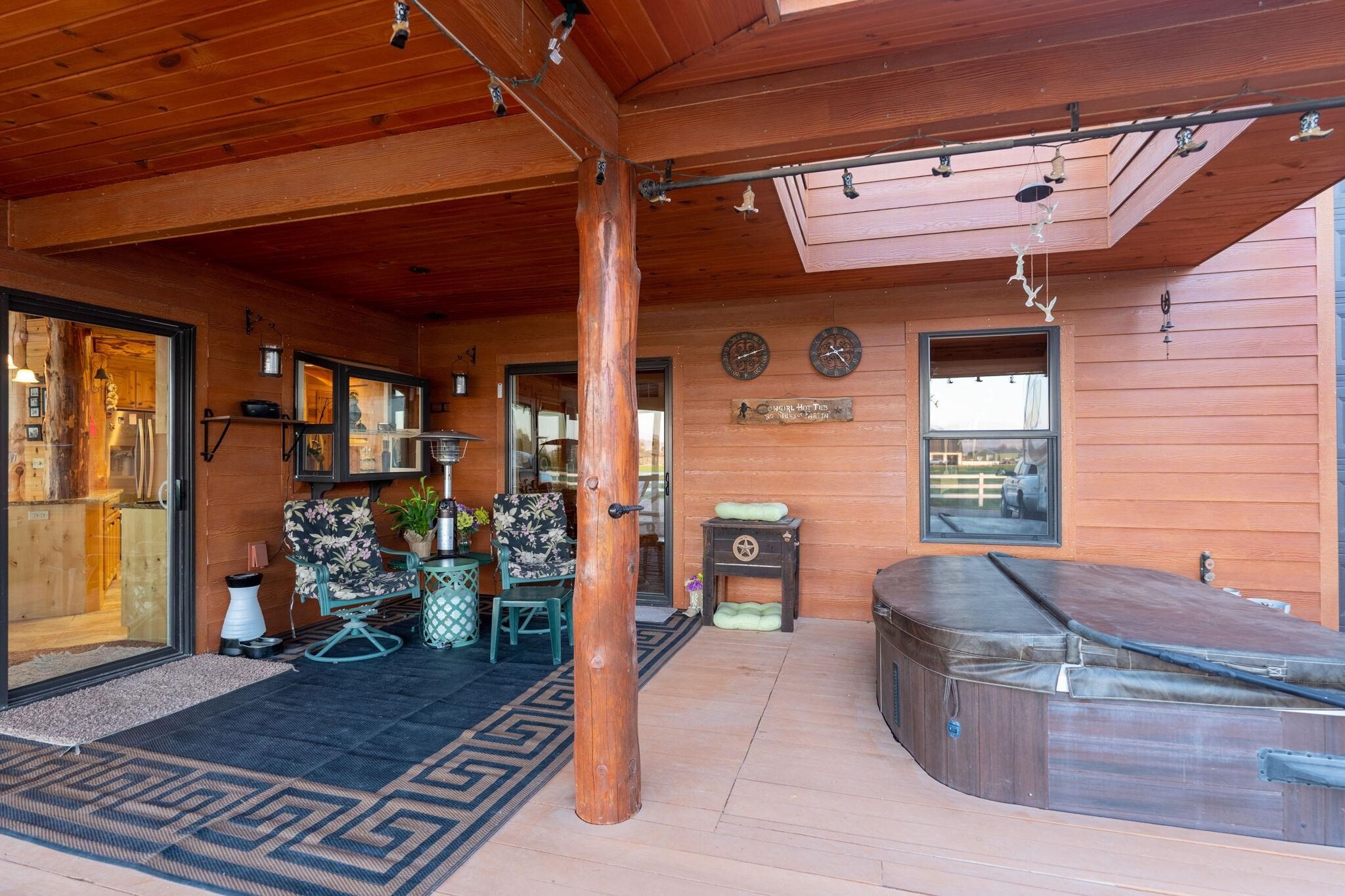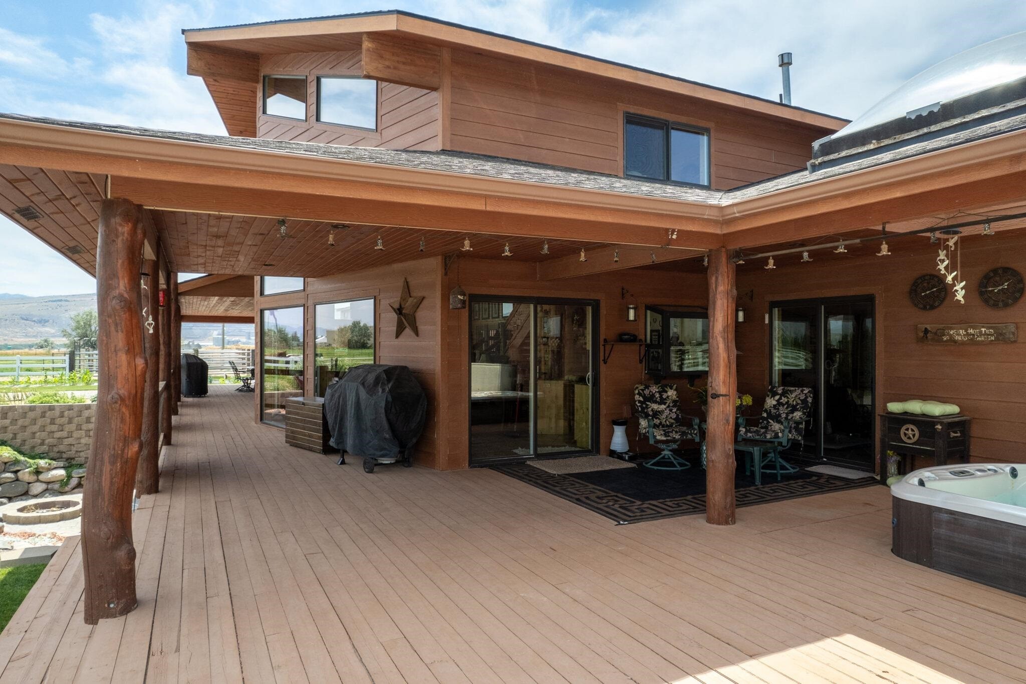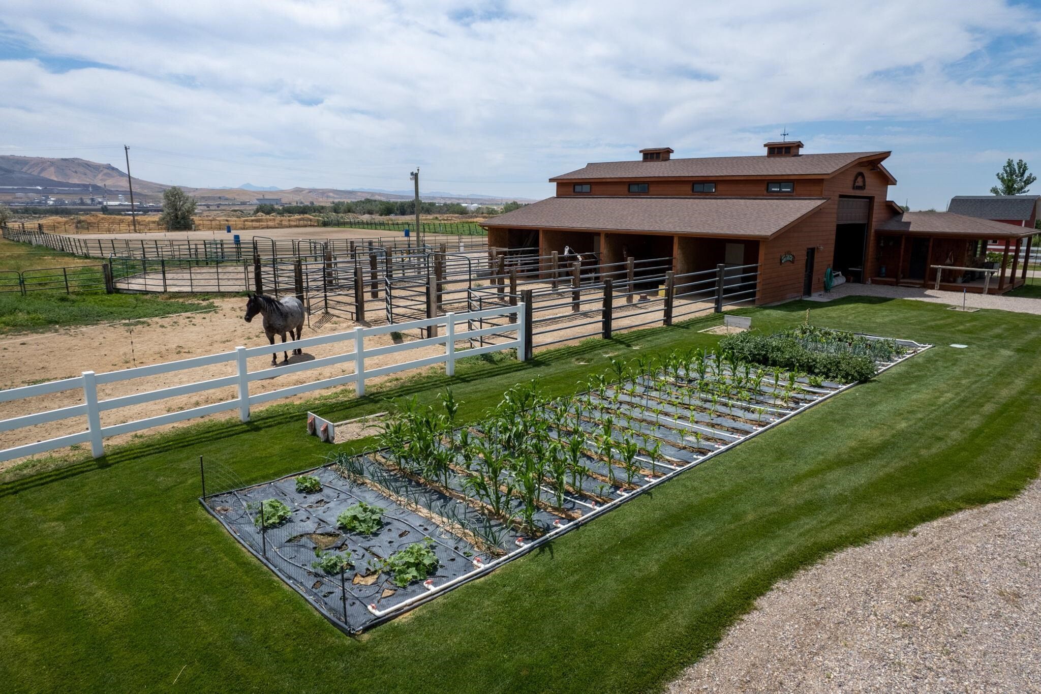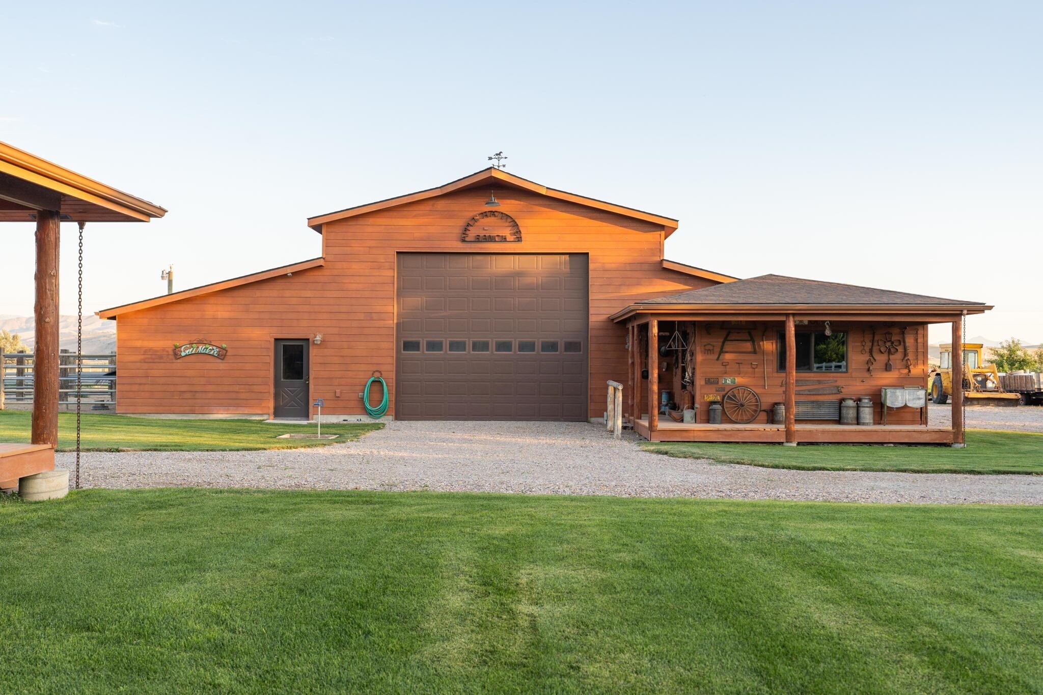 Horse property with luxury and efficiency in mind. Custom and rustic log home with passive-solar design. Open floor plan includes 21â vaulted ceiling in great room/game room. Main floor primary suite. 1400 sf covered deck. Ground-level attached garage boasts 14â drive-thru door RV storage. Wrap around drive lends access to a 1450 sf lower-level garage. Barn is 3,170 sf with 192 sf finished, climate controlled tack room with hot water, washer/dryer, & deep sink. 4 12 x 12â horse stalls each with 40â runs with automatic waterers. Barn includes 204 sf insulated shop w/50 amp welding circuit. Full-size riding arena w/dust control sprinklers & 50â round pen. Irrigation water rights. 3.5 acre pasture w/automated underground sprinkler system. Copy and paste link. https://www.aryeo.com/v2/896fbd3c-e643-4615-bd4b-6503163d9d77/videos/101242