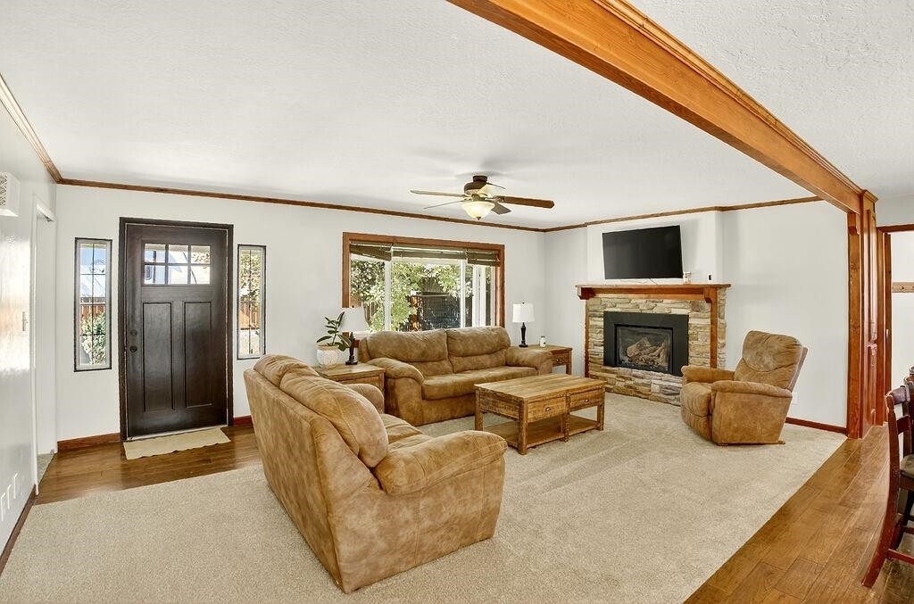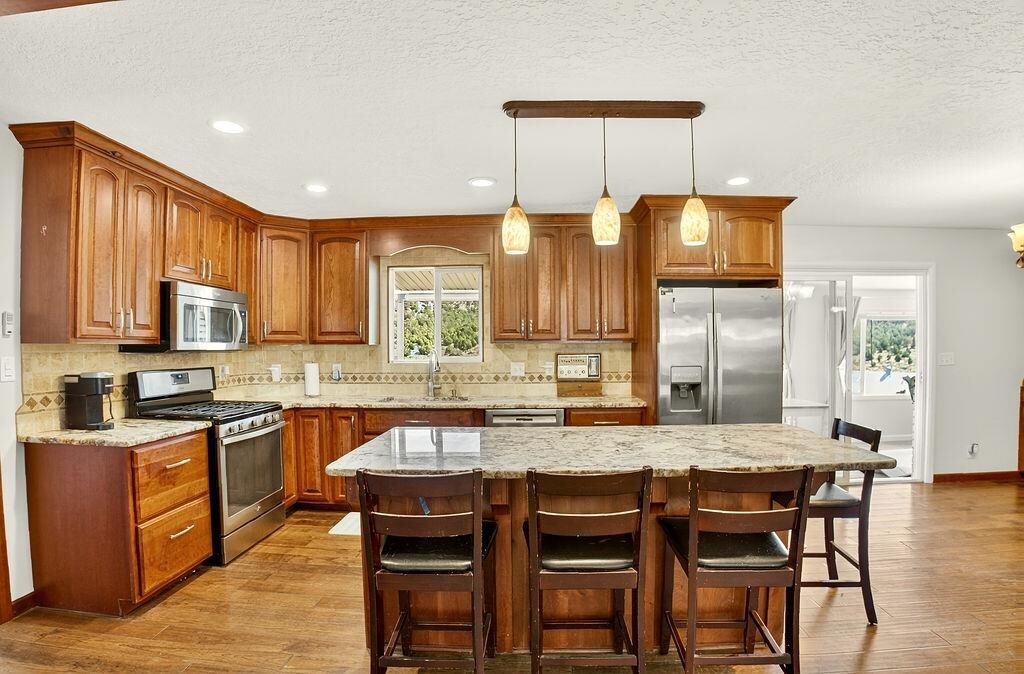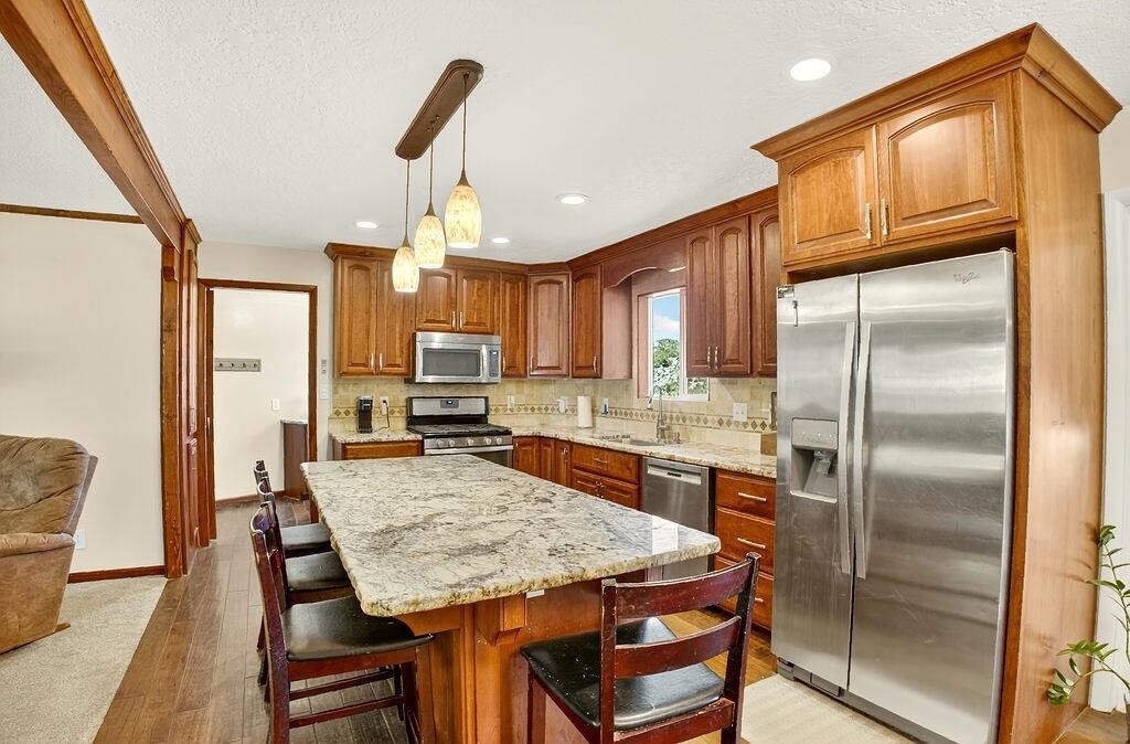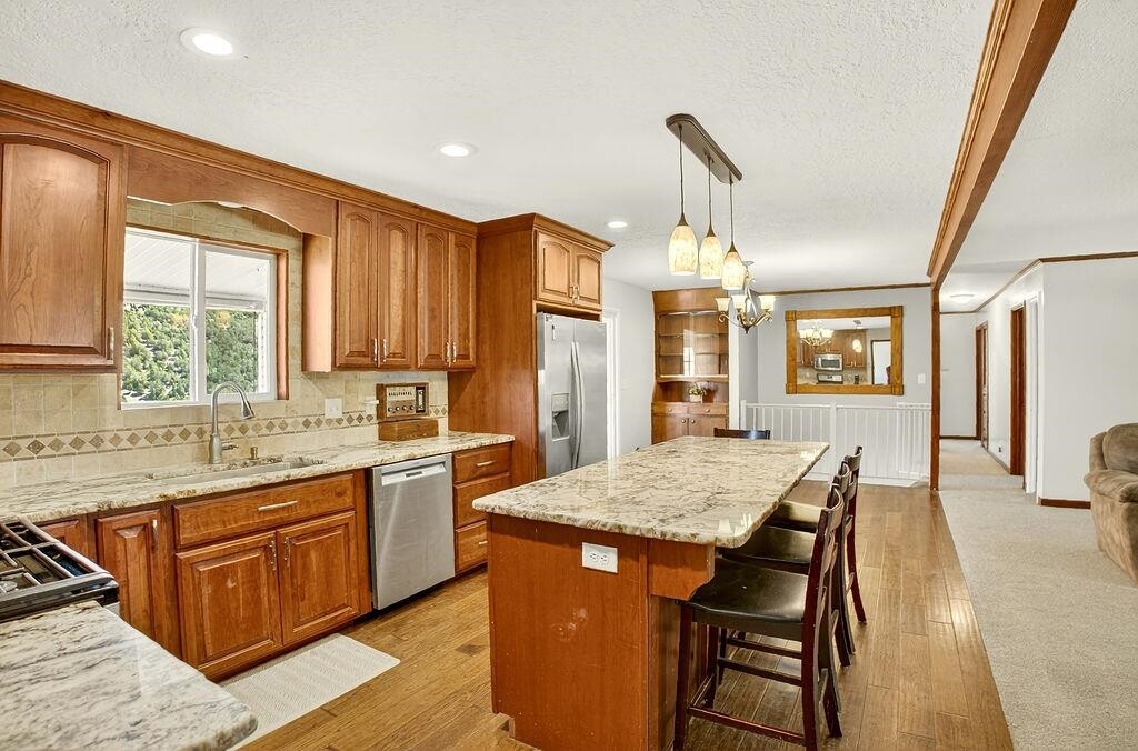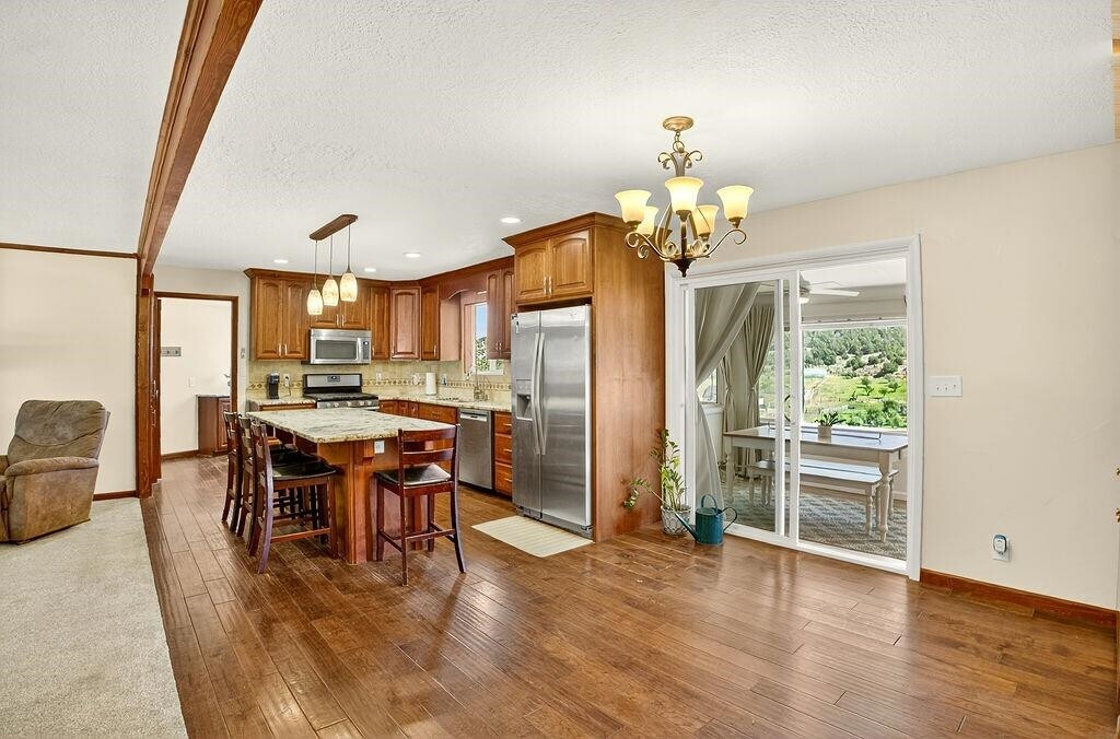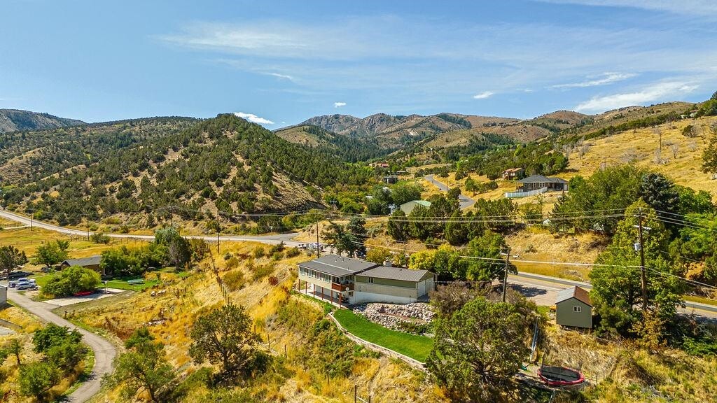 Looking for breathtaking views just outside of townâwithout paying for endless acreage? This home is the perfect fit! Nestled on a manageable 1/3 acre lot overlooking Mink Creek, and minutes to the Just minutes from Mink Creek Nordic Center & Hiking! Youâll enjoy year-round scenery right from your fully enclosed Sun deck! Inside, the updates shine! Fresh paint, vinyl windows, brand-new carpet, LVP flooring through out, a fully remodeled basement, and an open-concept main level brings a modern touch to this inviting home. The custom kitchen with granite countertops is perfect for cooking, entertaining, or just enjoying your day! With 5 bedrooms, 3 bathrooms, an office, recreation room, and a walk-out basement, this home has space for everyone. More bonus features include: vinyl siding, metal roof, storage shed, RV Parking, Covered Patio, Play area and more!