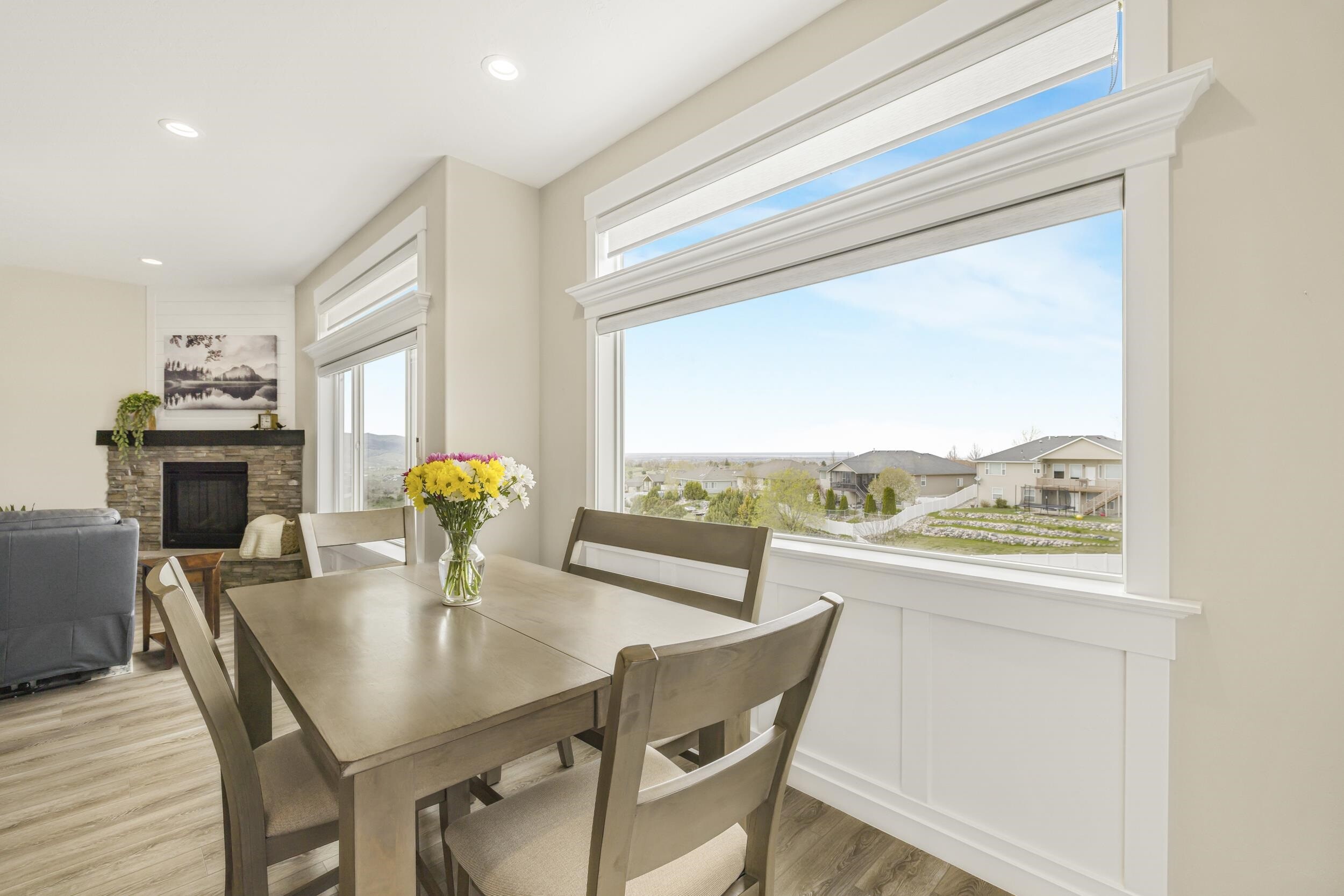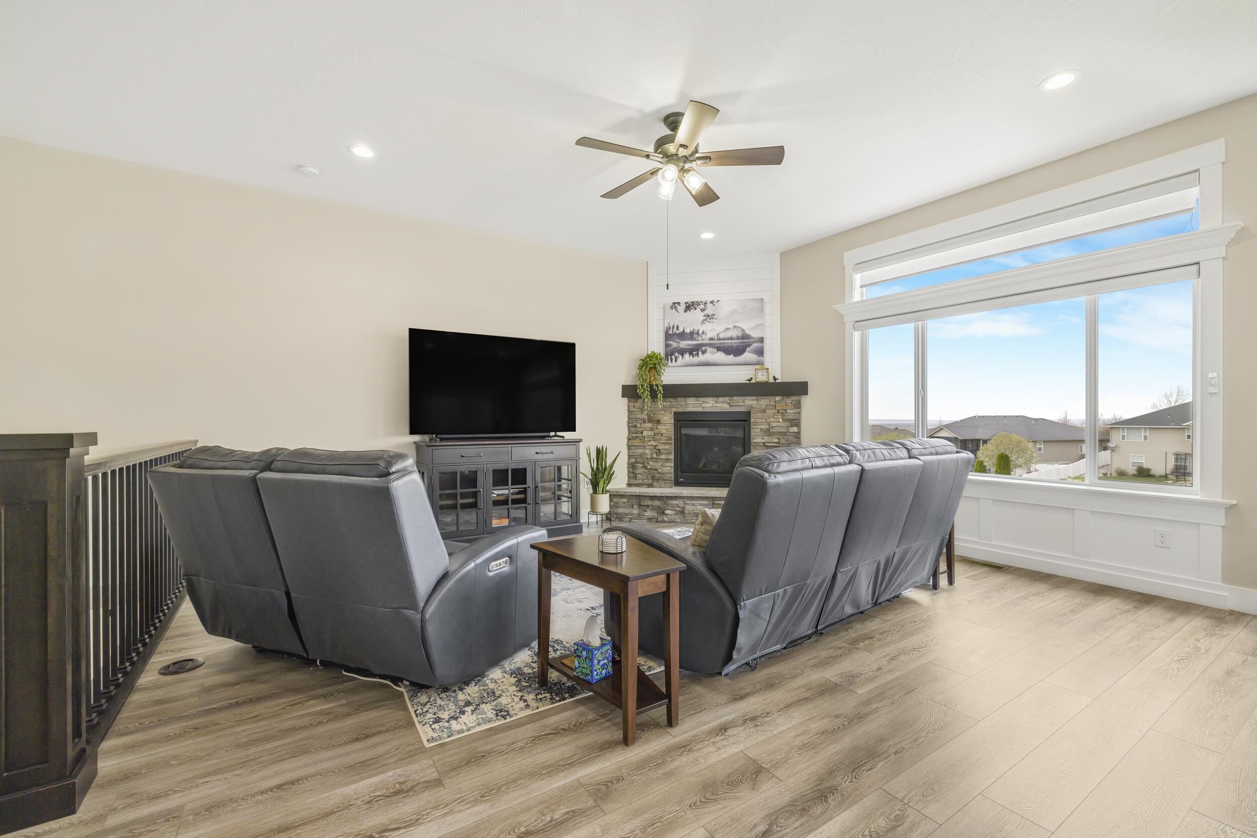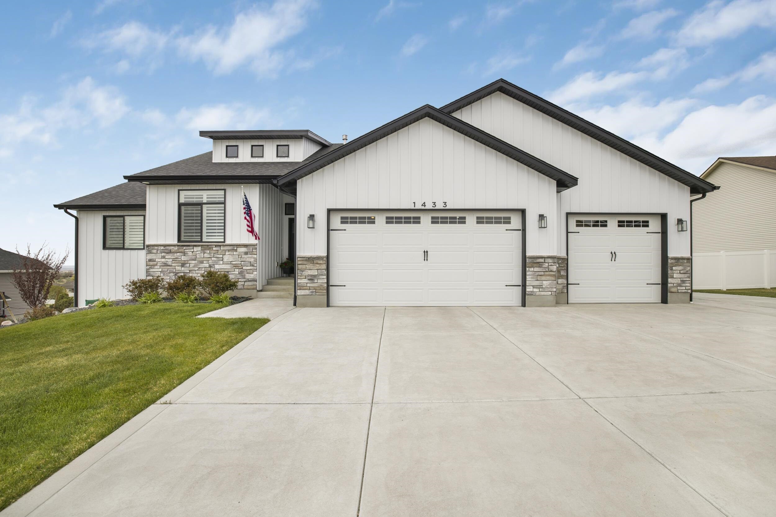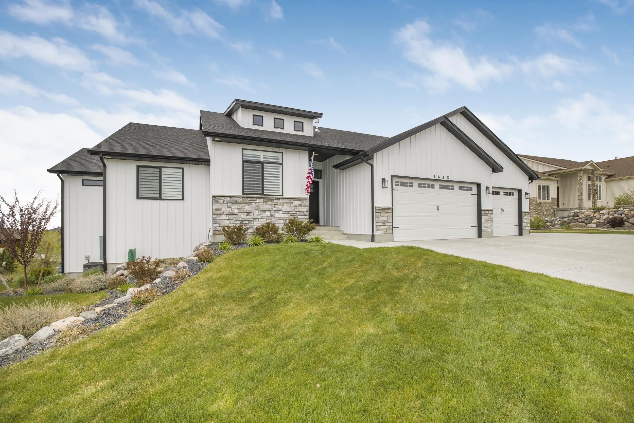 Welcome to 1433 Shadowpines â a beautifully crafted ranch-style home with a finished walkout basement, built in 2021 and offering 3,418 sq ft of high-end living space. Perfectly positioned for sweeping sunset views, this 5-bedroom, 3-bath home blends luxury, comfort, and functionality in one of the areaâs most well-maintained and sought-after neighborhoods, known for its clean streets, friendly neighbors, and safe, welcoming atmosphere. The open-concept main floor features a bright and spacious living area with a gas fireplace that efficiently heats the entire level. The kitchen, dining, and living spaces flow seamlessly, ideal for both daily living and entertaining. The primary suite offers a spa-like retreat with a double-sink vanity, deep soaking tub, dual-head walk-in shower, separate water closet, blackout blinds, dedicated electric heater, and a large walk-in closet. Three bedrooms include walk-in closets, and all bathrooms are equipped with built-in linen storage. This home is well-suited for multi-generational living, offering single-level functionality and flexible space below. Additional upgrades include a whole-house water softener, reverse osmosis system, two large storage rooms (one with a utility sink), and motorized blinds in the main living area. Outside, enjoy a fully landscaped low-maintenance yard with an automated sprinkler system, hot tub, RV pad, and a partially fenced backyardâperfect for relaxing without the hassle of upkeep. The oversized 4-car garage features a mini-split system and ample space for a workshop. Conveniently located just minutes from the Portneuf Wellness Complex. This home truly has it all â style, space, and an unbeatable setting.