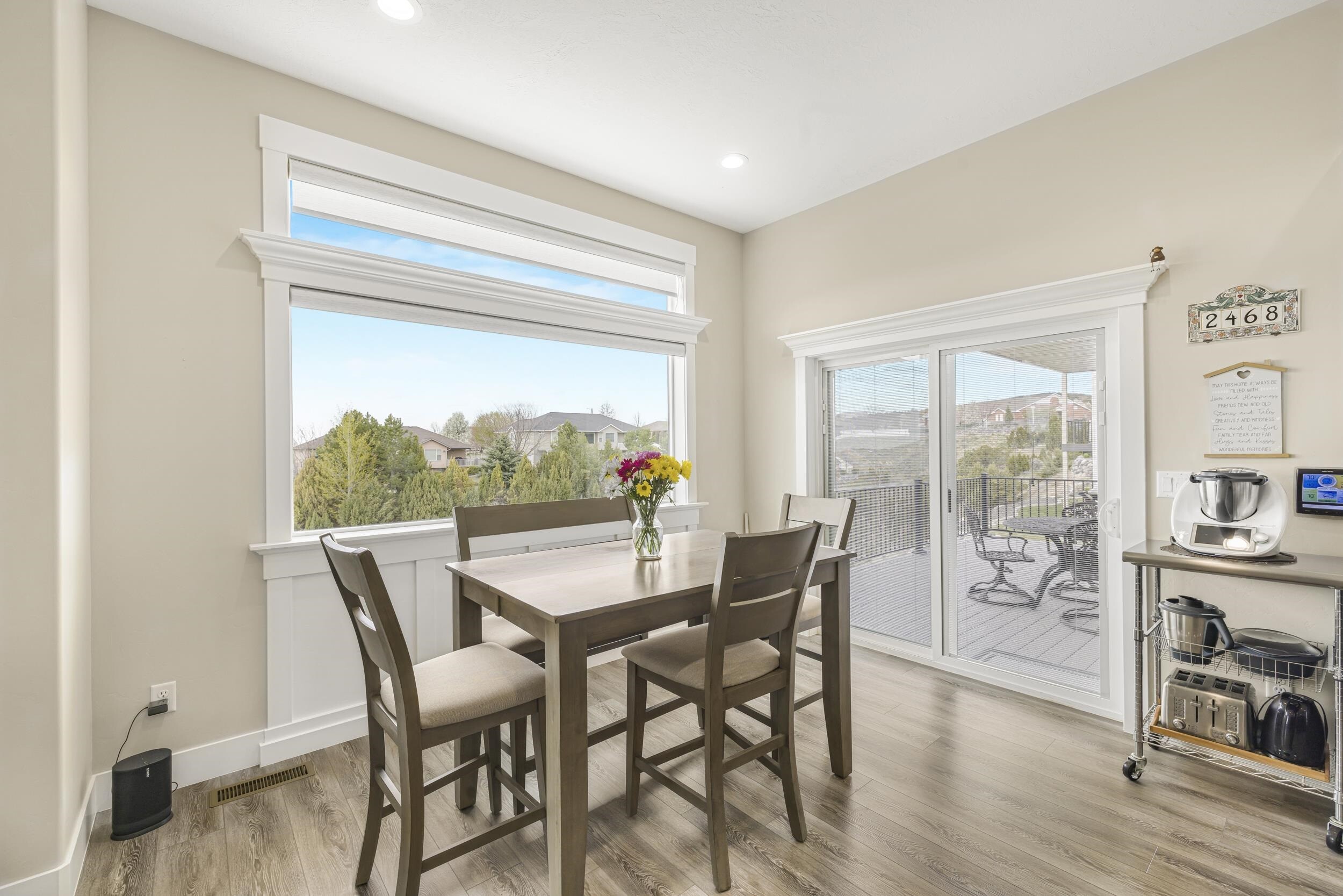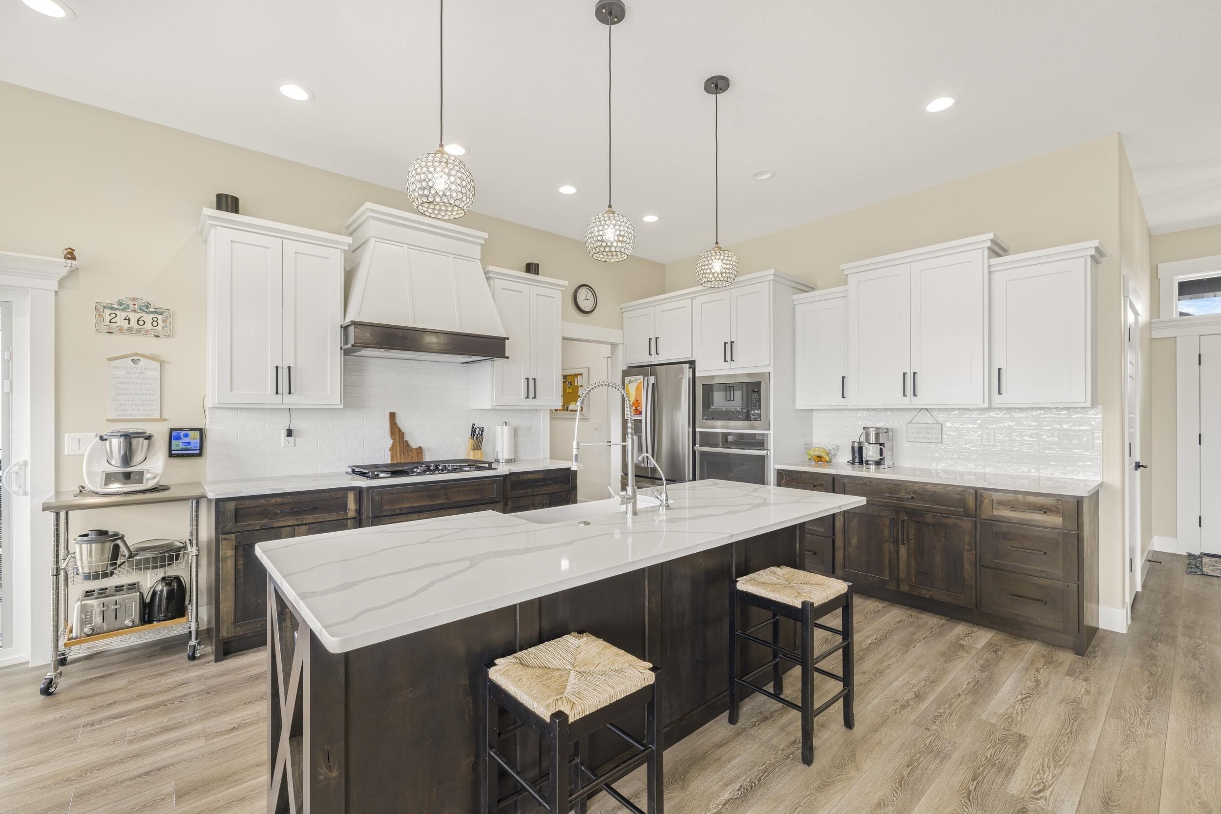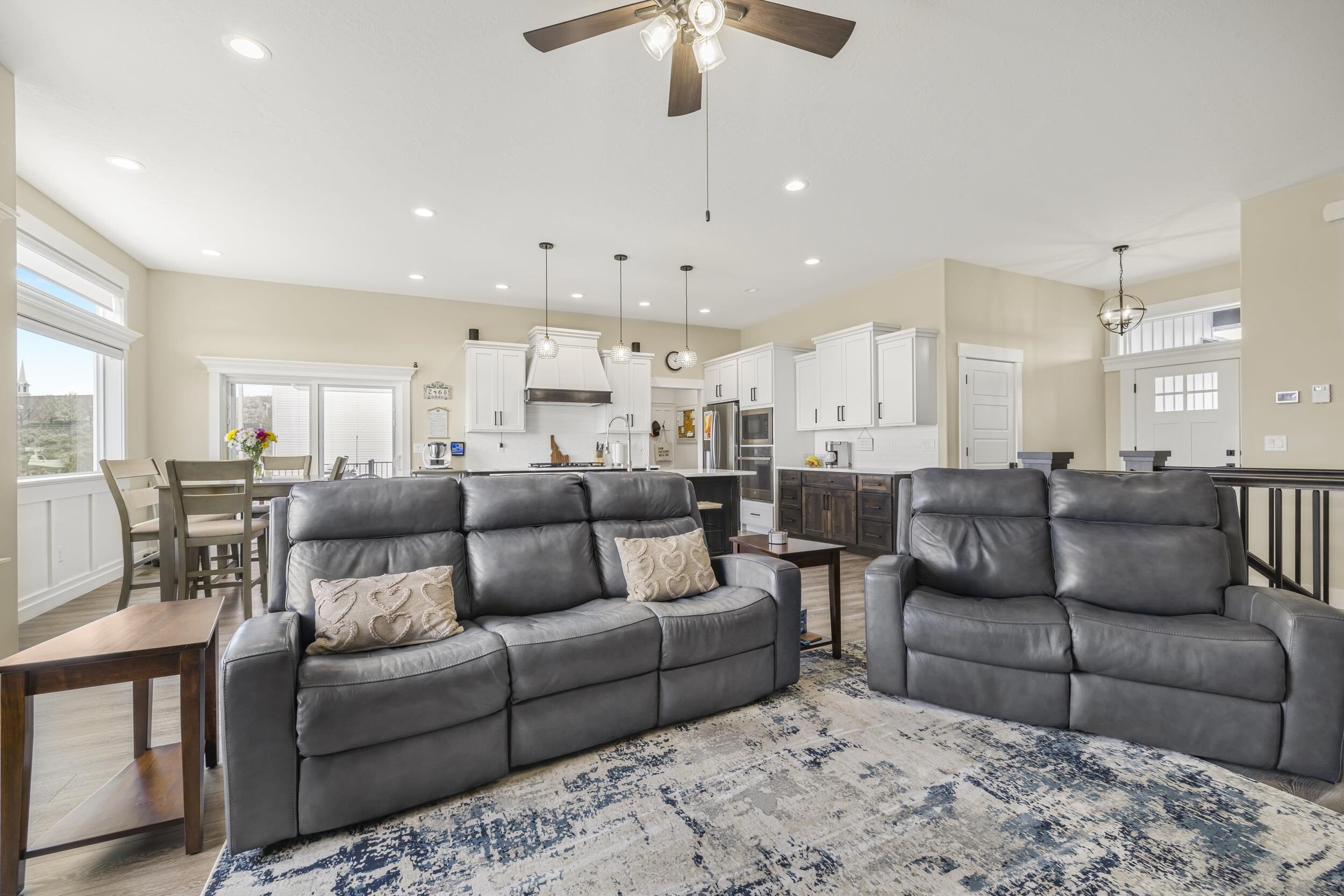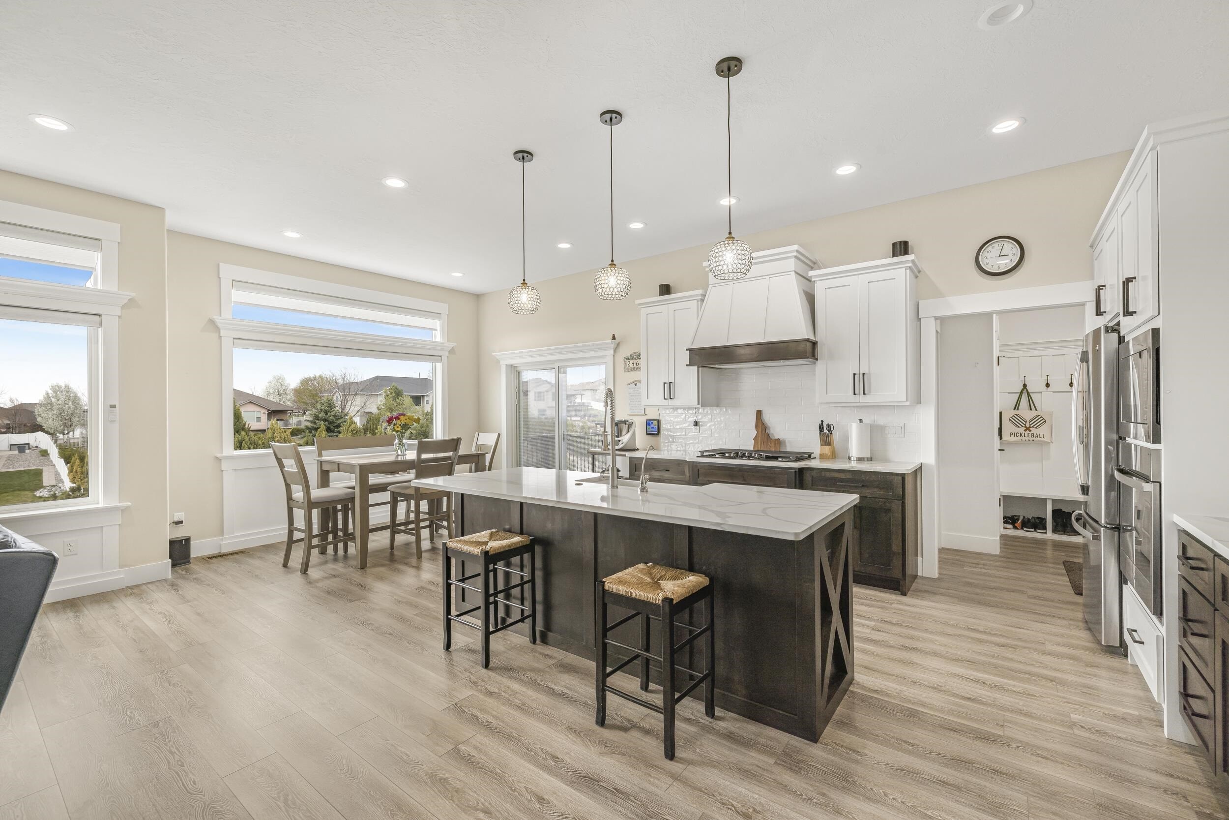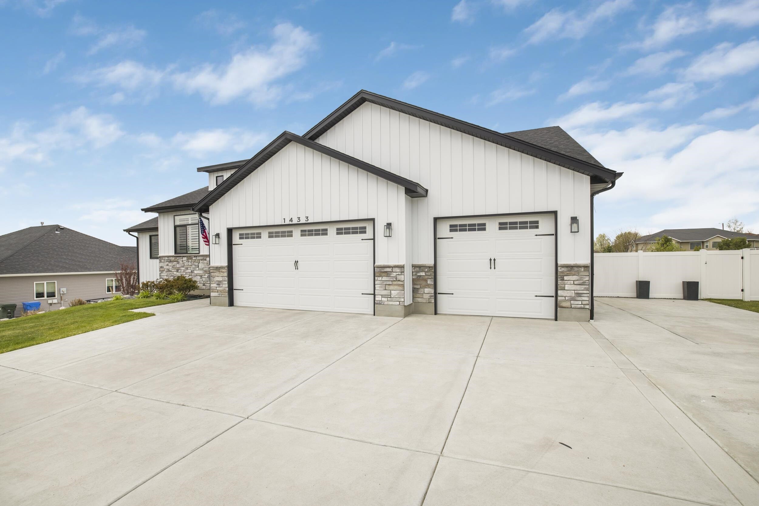 Welcome to 1433 Shadowpines â a beautifully crafted ranch-style home with a finished walkout basement, built in 2021 and offering 3,418 sq ft of high-end living space. Perfectly positioned for sweeping sunset views, this 5-bedroom, 3-bath home blends luxury, comfort, and functionality in one of the areaâs most well-maintained and sought-after neighborhoods, known for its clean streets, friendly neighbors, and safe, welcoming atmosphere. The open-concept main floor features a bright and spacious living area with a gas fireplace that efficiently heats the entire level. The kitchen, dining, and living spaces flow seamlessly, ideal for both daily living and entertaining. The primary suite offers a spa-like retreat with a double-sink vanity, deep soaking tub, dual-head walk-in shower, separate water closet, blackout blinds, dedicated electric heater, and a large walk-in closet. Three bedrooms include walk-in closets, and all bathrooms are equipped with built-in linen storage. This home is well-suited for multi-generational living, offering single-level functionality and flexible space below. Additional upgrades include a whole-house water softener, reverse osmosis system, two large storage rooms (one with a utility sink), and motorized blinds in the main living area. Outside, enjoy a fully landscaped low-maintenance yard with an automated sprinkler system, hot tub, RV pad, and a partially fenced backyardâperfect for relaxing without the hassle of upkeep. The oversized 4-car garage features a mini-split system and ample space for a workshop. Conveniently located just minutes from the Portneuf Wellness Complex. This home truly has it all â style, space, and an unbeatable setting.
