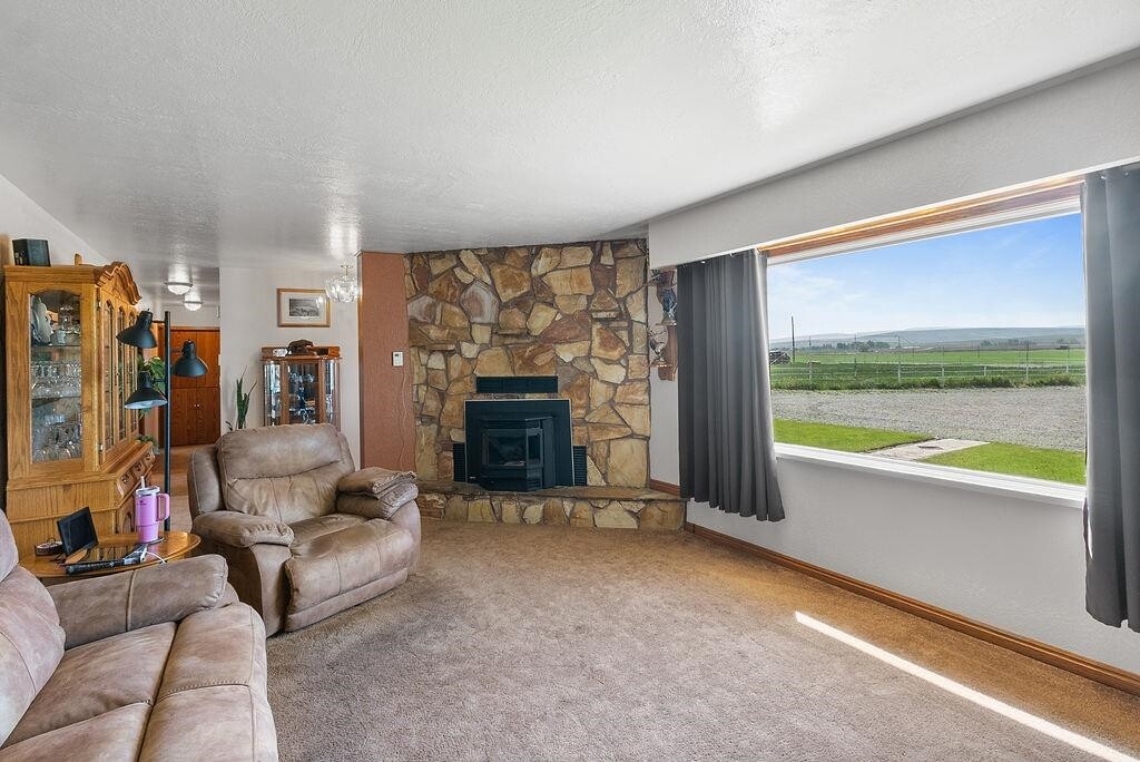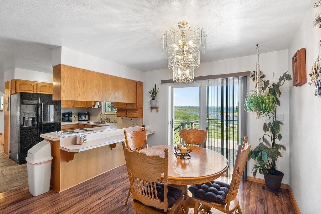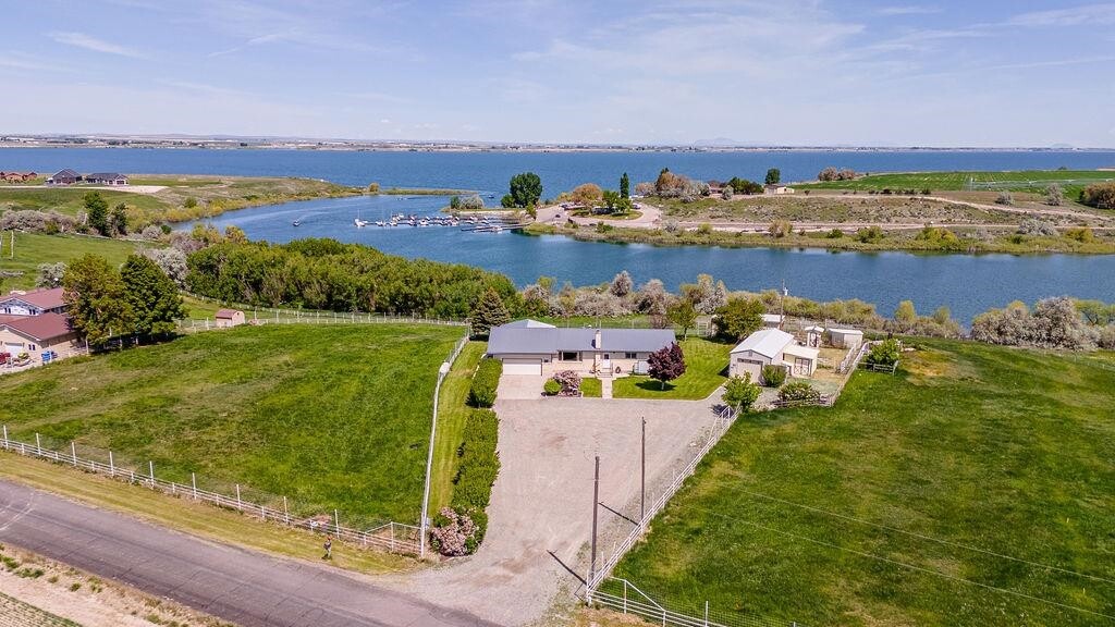 Welcome to your Dream Hobby Homestead, a Rare Find Backed up to the Lake with Breathtaking Views of Seagull Bay! Sitting on 5 acres with pressurized irrigation, and everything you need for Rural Living, Entertaining, and Self-Sufficiency! Outdoor Features: Horse barn, stall shoots, hay storage, calving barn, & room for animals with and 8-ft Metal Fence-Formally an Elk Farm! Lawn shed, shop w/ 220V power, workbench, and plenty of outlets -perfect for projects! Covered patio and deck offer outdoor enjoyment in any weather. Beautiful water feature adds charm and relaxation. Just 5 minutes from Town, freeway access and the Boat Launch! Or a short jot to the Lake for a Swim, Paddle Board, or Kayaking! During Duck & Goose Season-You can just walk to some of the best hunting spots! Brick and metal exterior with a durable metal roof-built to last. Don’t miss the Home Highlights: Spacious kitchen with double ovens and unbeatable lake views while you cook. Master bedroom- fits a king-size Bedroom set. Updated bathroom, Large pantry with cool storage for modern convenience. Two pellet stoves efficiently heat the entire home! Finished basement for hosting guests, game nights, or relaxing with a cold drink. 2-car garage with ample storage shelves! Live the Lifestyle: Whether youâre looking to raise animals, enjoy sunsets over the bay, host gatherings on your patio, or hunt ducks and geese in your backyard, this property offers endless possibilities with unbeatable charm!