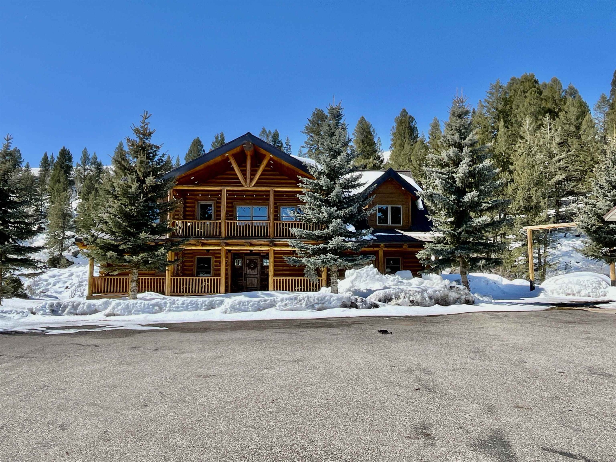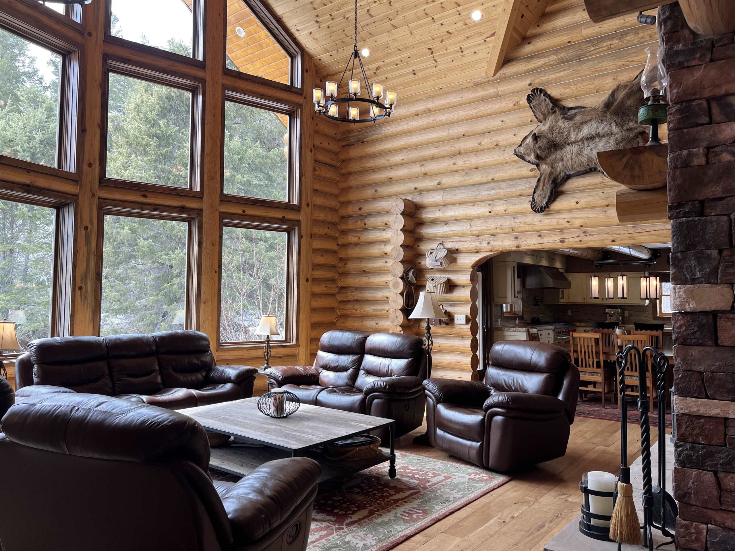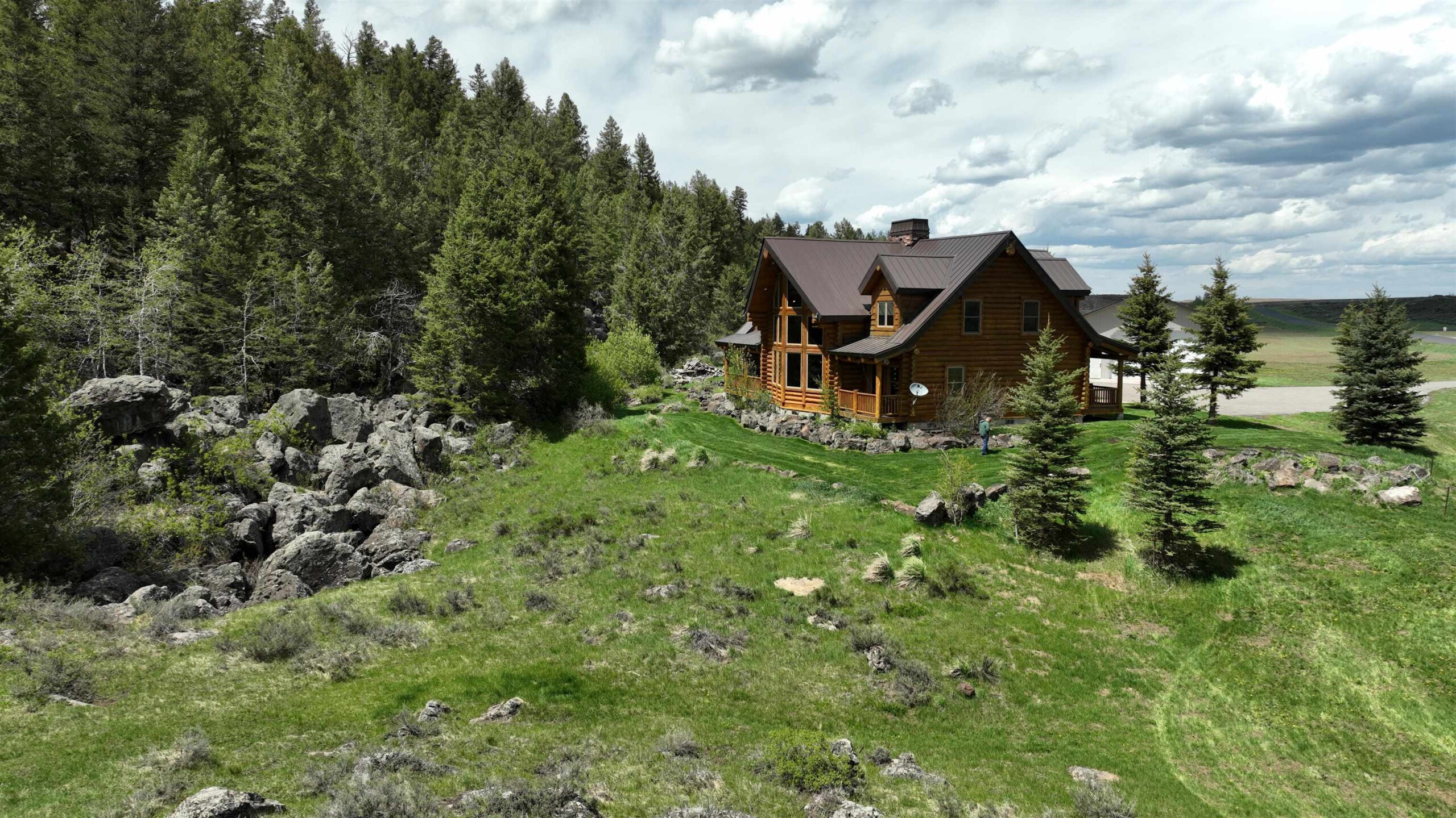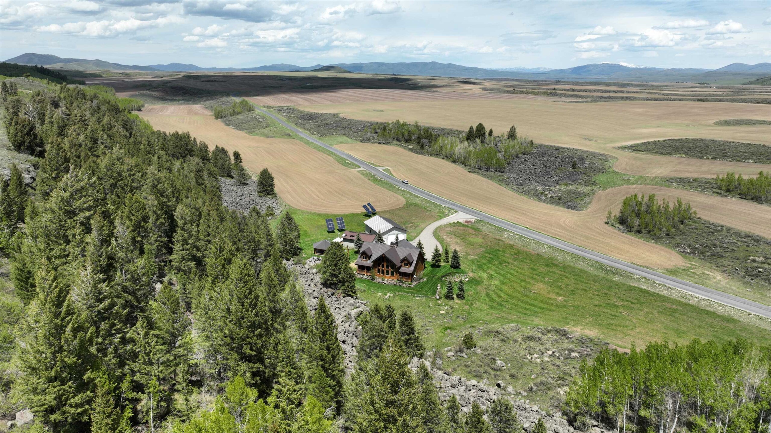 Fully Furnished Custom-Built Log Cabin Near Blackfoot Reservoir – Year-round county paved road access – 3,466 +/- square feet, 5 bedroom, 3 1/2 bath custom-built log cabin built 2013-2014 – Overhead power will be pulled to the property replacing the off-the-grid capability – Inverter will be installed for 4 solar panels to backfeed grid – Deep bay 54′ x 34′ workshop with 2 RV doors – 22′ x 36′ Detached garage will be leveled and not be rebuilt – Screwless metal roof replaced in 2024 – 2 efficient stone wood burning fireplaces with abundant firewood included – Mountain Land KitchenAid stainless steel appliances, gourmet Wolf range and Sub-Zero refrigerator freezer – Solid wood handcrafted Amish furniture, gun safe, pool table, Traeger smoker, and Weber grill – Thick granite countertops and backsplash – Slate shower and tub surrounds – Flooring: Rough cut finish walnut, slate, stone, and carpet – 3 Pressurized accumulator tanks, water softener, and tankless hot water heater – 110v hot tub on upper-level covered deck – 34+/- acres west of Government Damn Road will be split off 80-acre parcel prior to closing — Tucked in the tall evergreens near Blackfoot Reservoir, this fully furnished custom-built log home, the Coeur d’Alene, with tongue and groove construction, offers a turnkey high-country retreat or year-round residence. With handcrafted solid wood Amish furniture throughout, this beautifully appointed, 3,466 +/- square foot, five-bedroom, three-and-a-half bath cabin built in 2014 currently sits on eighty acres with a detached garage and shop. Overhead power will be pulled to the property this fall, replacing the off-the-grid capability, and an inverter will be installed in the deep bay workshop to allow the solar panels to backfeed the grid. This could provide credits on your electricity bill. The landowner will split off this homestead of approximately thirty-four acres of ground west of Government Dam Road prior to closing. The open floor plan with vaulted ceilings and natural light streaming in through the many expansive windows creates a welcoming glow against the warm wood beams and beautiful, rough-cut finish walnut hardwood flooring throughout. In the fall, the lush evergreen carpeted ridge is particularly vibrant against the golden leaves and white trunks of the aspens. Painted kitchen cabinets and coordinating backsplash provide a fresh, contemporary vibe, and the decorative ceiling logs are the perfect accent to meld the two. Boasting Mountain Land KitchenAid stainless steel appliances, a gourmet Wolf range, and a Sub-Zero refrigerator freezer, thick granite countertops with rough edge finish, and backsplash throughout the home. Slate tub and shower surrounds are complemented by slate and stone flooring in the bathrooms and carpet in the upstairs bedrooms. The master bath subfloor is heated for added comfort. At the end of the day, enjoy a nice, relaxing soak in the clawfoot tub and curl up by one of the wood-burning fireplaces with a good book. The 54′ x 34′ deep bay workshop with two RV doors provides plenty of room to park and store your vehicles, RV, boat, and ATVs, and work on projects at your leisure, and the asphalt driveway offers ample parking to accommodate your guests’ vehicles. Two efficient and reinforced stone wood-burning fireplaces are focal points and poised for heavy mounts to be hung securely. Abundant firewood is stacked inside the shop and at your disposal. Experience the serenity of the outdoors year-round on the covered decks and fireside pavilion picnic area. The main level covered front porch is the full length of the cabin and provides two separate entrances and ample space for greeting guests and seating. The covered deck off the kitchen is plumbed for propane and equipped with a Weber grill and Traeger smoker. Enjoy a little peace and possibly wildlife viewing on the master bedroom deck. A 110-volt hot tub and outdoor furniture await on the upper-level covered deck