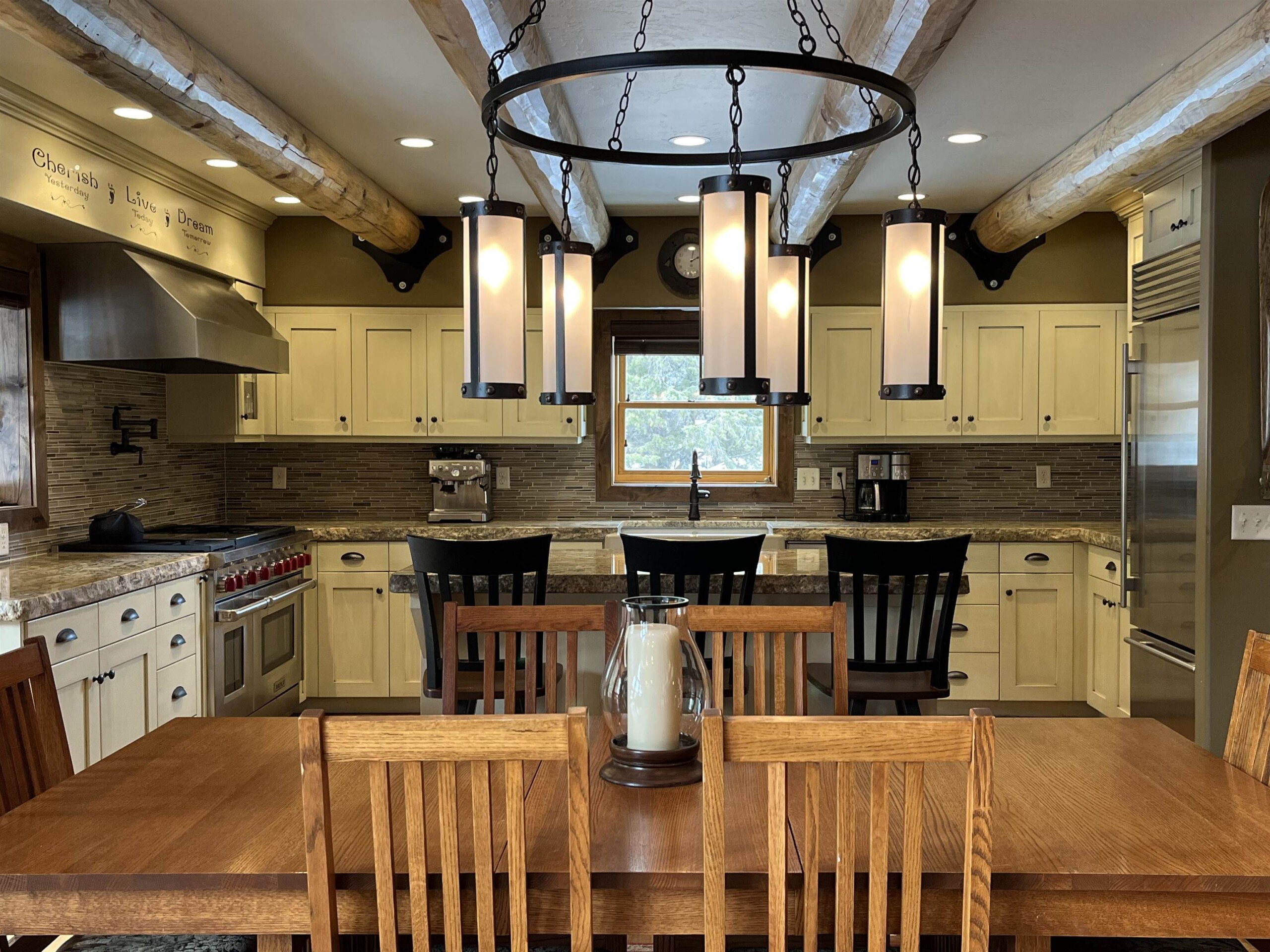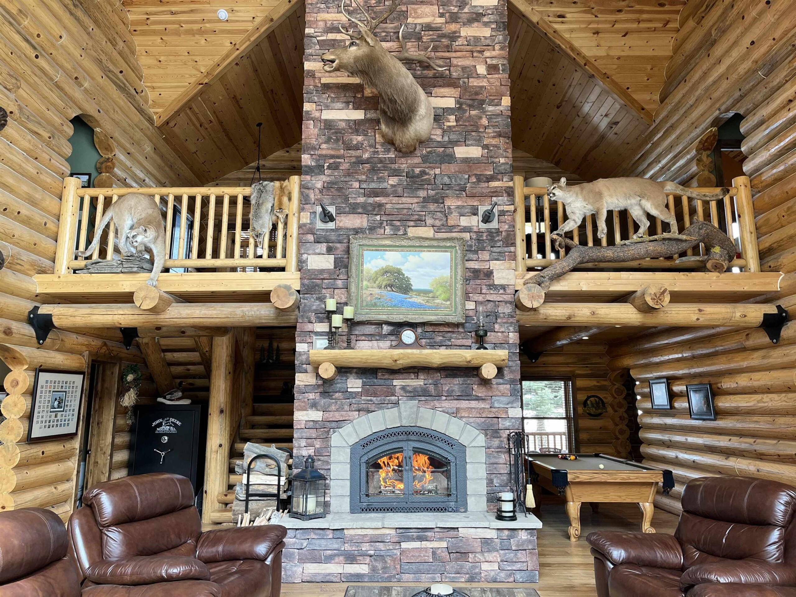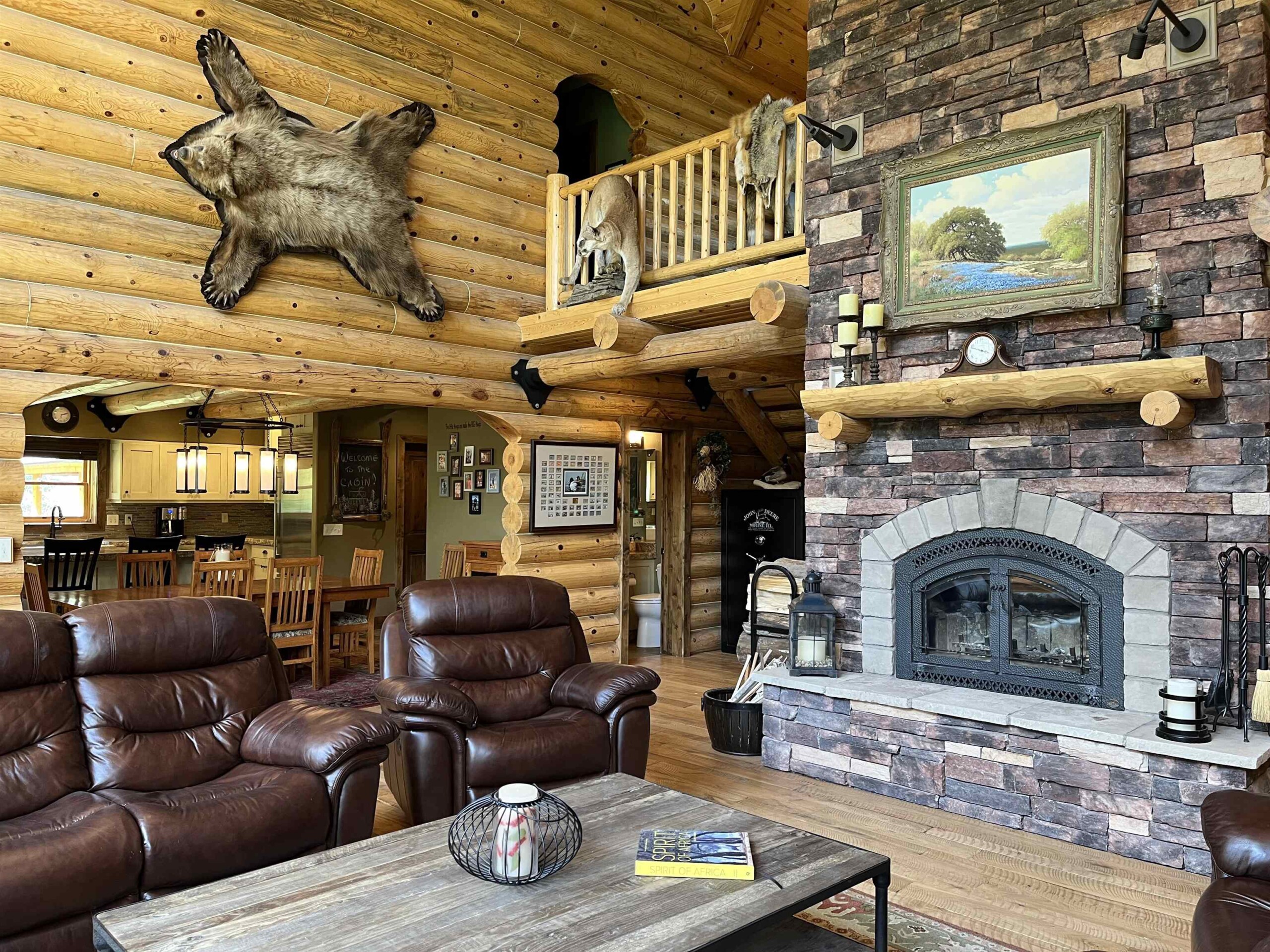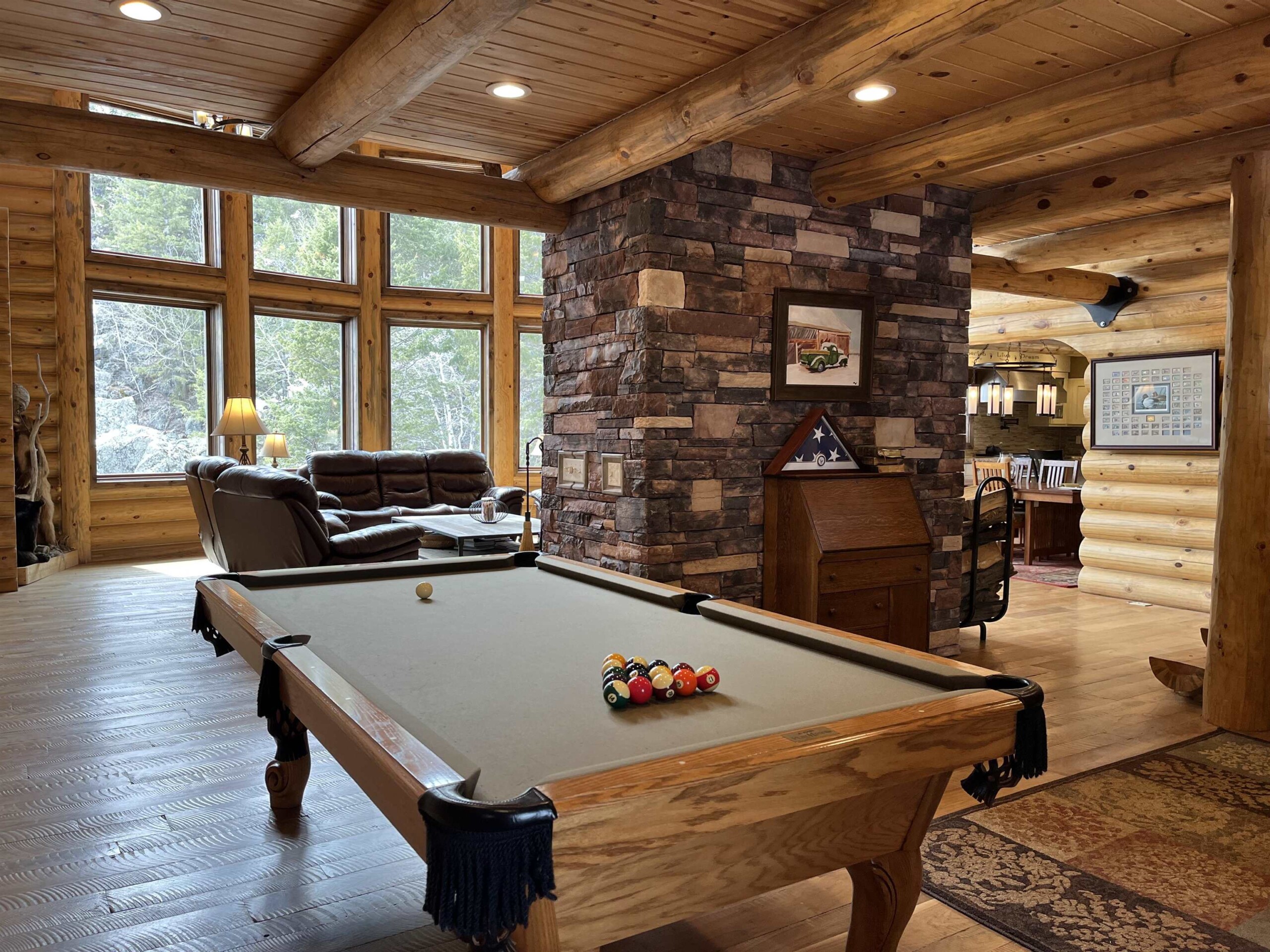 Fully Furnished Custom-Built Log Cabin Near Blackfoot Reservoir – Year-round county paved road access – 3,466 +/- square feet, 5 bedroom, 3 1/2 bath custom-built log cabin built 2013-2014 – Overhead power will be pulled to the property replacing the off-the-grid capability – Inverter will be installed for 4 solar panels to backfeed grid – Deep bay 54′ x 34′ workshop with 2 RV doors – 22′ x 36′ Detached garage will be leveled and not be rebuilt – Screwless metal roof replaced in 2024 – 2 efficient stone wood burning fireplaces with abundant firewood included – Mountain Land KitchenAid stainless steel appliances, gourmet Wolf range and Sub-Zero refrigerator freezer – Solid wood handcrafted Amish furniture, gun safe, pool table, Traeger smoker, and Weber grill – Thick granite countertops and backsplash – Slate shower and tub surrounds – Flooring: Rough cut finish walnut, slate, stone, and carpet – 3 Pressurized accumulator tanks, water softener, and tankless hot water heater – 110v hot tub on upper-level covered deck – 34+/- acres west of Government Damn Road will be split off 80-acre parcel prior to closing — Tucked in the tall evergreens near Blackfoot Reservoir, this fully furnished custom-built log home, the Coeur d’Alene, with tongue and groove construction, offers a turnkey high-country retreat or year-round residence. With handcrafted solid wood Amish furniture throughout, this beautifully appointed, 3,466 +/- square foot, five-bedroom, three-and-a-half bath cabin built in 2014 currently sits on eighty acres with a detached garage and shop. Overhead power will be pulled to the property this fall, replacing the off-the-grid capability, and an inverter will be installed in the deep bay workshop to allow the solar panels to backfeed the grid. This could provide credits on your electricity bill. The landowner will split off this homestead of approximately thirty-four acres of ground west of Government Dam Road prior to closing. The open floor plan with vaulted ceilings and natural light streaming in through the many expansive windows creates a welcoming glow against the warm wood beams and beautiful, rough-cut finish walnut hardwood flooring throughout. In the fall, the lush evergreen carpeted ridge is particularly vibrant against the golden leaves and white trunks of the aspens. Painted kitchen cabinets and coordinating backsplash provide a fresh, contemporary vibe, and the decorative ceiling logs are the perfect accent to meld the two. Boasting Mountain Land KitchenAid stainless steel appliances, a gourmet Wolf range, and a Sub-Zero refrigerator freezer, thick granite countertops with rough edge finish, and backsplash throughout the home. Slate tub and shower surrounds are complemented by slate and stone flooring in the bathrooms and carpet in the upstairs bedrooms. The master bath subfloor is heated for added comfort. At the end of the day, enjoy a nice, relaxing soak in the clawfoot tub and curl up by one of the wood-burning fireplaces with a good book. The 54′ x 34′ deep bay workshop with two RV doors provides plenty of room to park and store your vehicles, RV, boat, and ATVs, and work on projects at your leisure, and the asphalt driveway offers ample parking to accommodate your guests’ vehicles. Two efficient and reinforced stone wood-burning fireplaces are focal points and poised for heavy mounts to be hung securely. Abundant firewood is stacked inside the shop and at your disposal. Experience the serenity of the outdoors year-round on the covered decks and fireside pavilion picnic area. The main level covered front porch is the full length of the cabin and provides two separate entrances and ample space for greeting guests and seating. The covered deck off the kitchen is plumbed for propane and equipped with a Weber grill and Traeger smoker. Enjoy a little peace and possibly wildlife viewing on the master bedroom deck. A 110-volt hot tub and outdoor furniture await on the upper-level covered deck