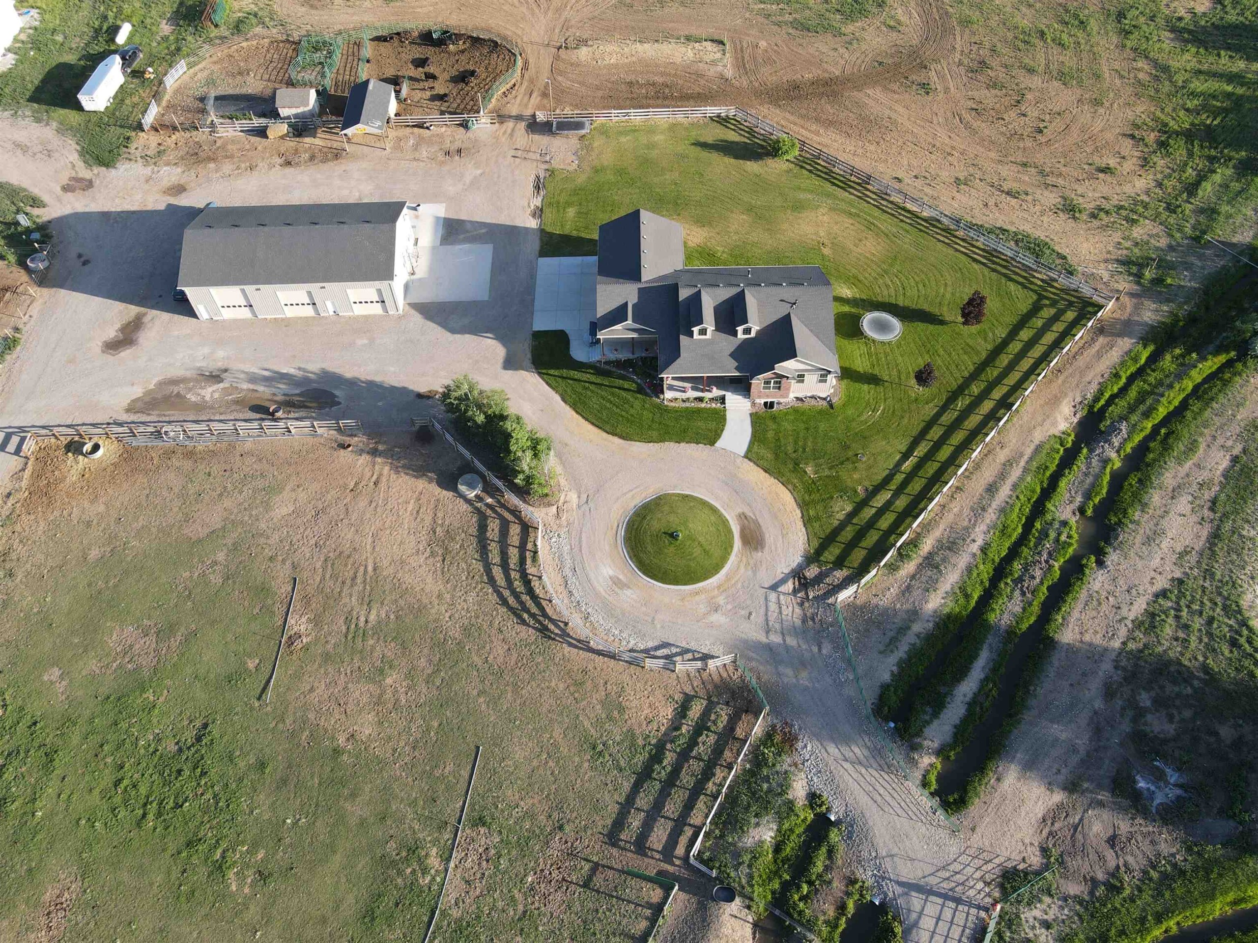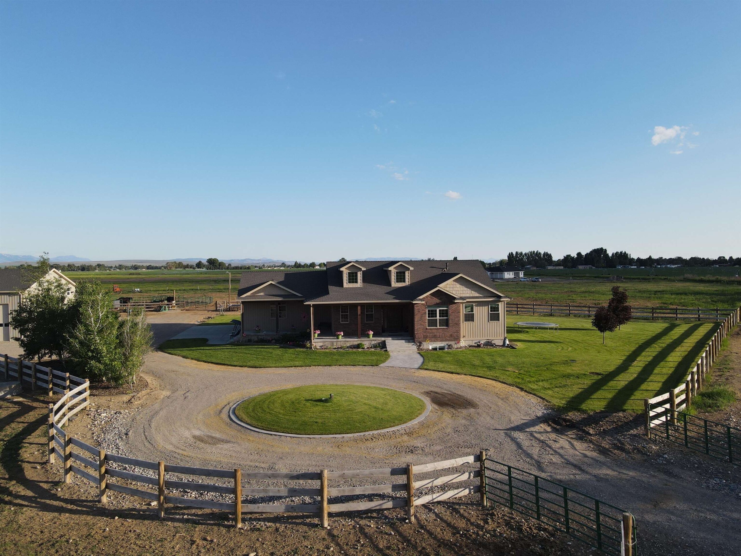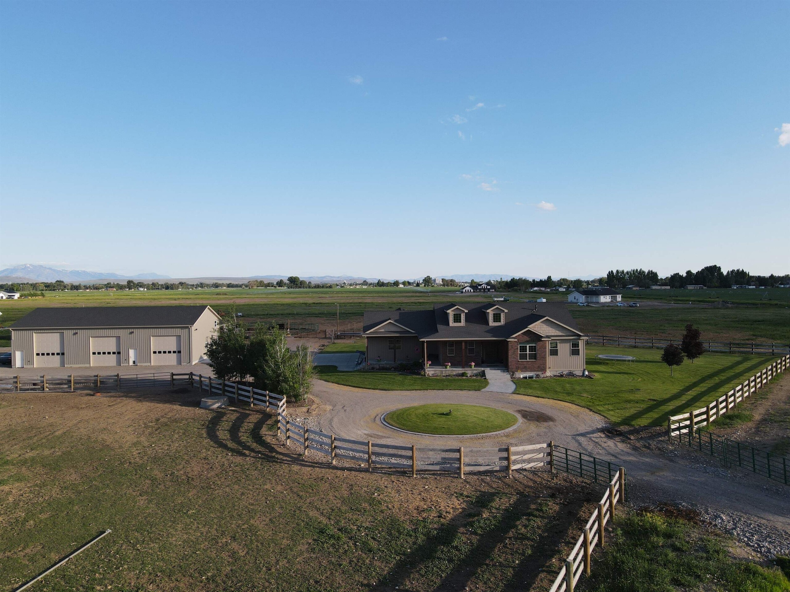 Gorgeous country home on 33.81 sprawling acres, perfect for horses, cattle, or a hobby farm! The main level features 9-ft ceilings, wood floors, office, front room, vaulted great room with gas fireplace, and an open kitchen with custom cabinets, granite countertops, double oven, island, pantry, and under-cabinet lighting. Enjoy a covered deck off the dining area. The primary suite offers an elevated ceiling, jetted tub, custom shower with dual heads, and dual vanities. A second bedroom and bath complete the main floor. The spacious laundry/mud room includes sink, counters, cabinets, and drinking fountain. Basement offers 3 bedrooms, full bath, family room with kitchenette, and cold storage. Outside: 40×70 insulated 3-bay shop plus salon/office with half bath. Also listed with 8 acres (MLS 580669).