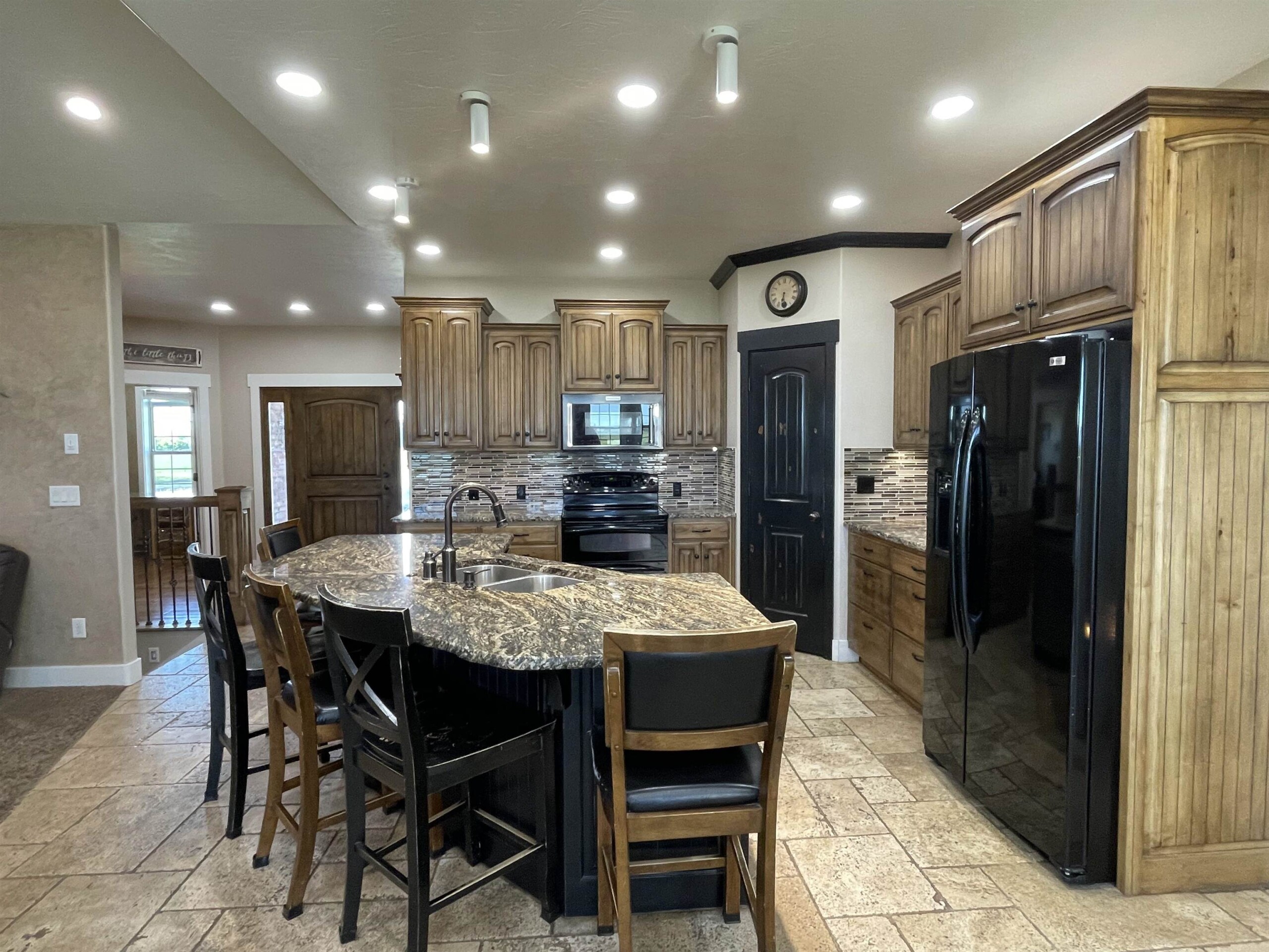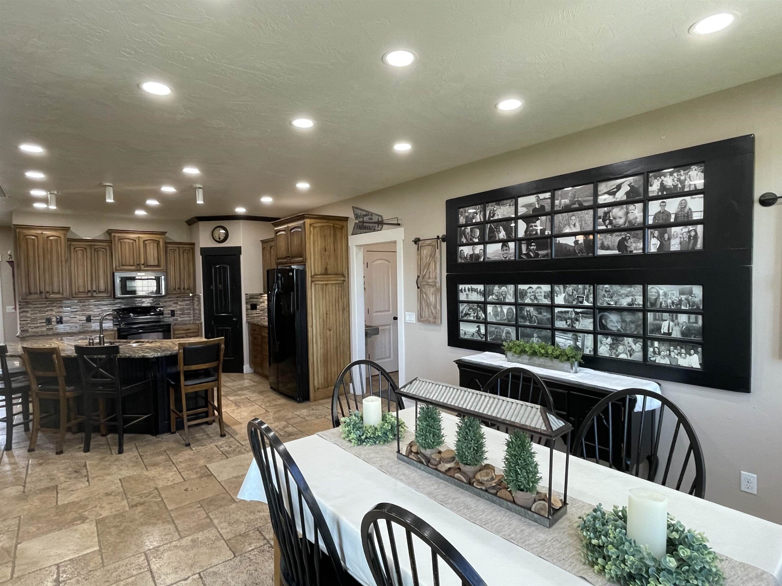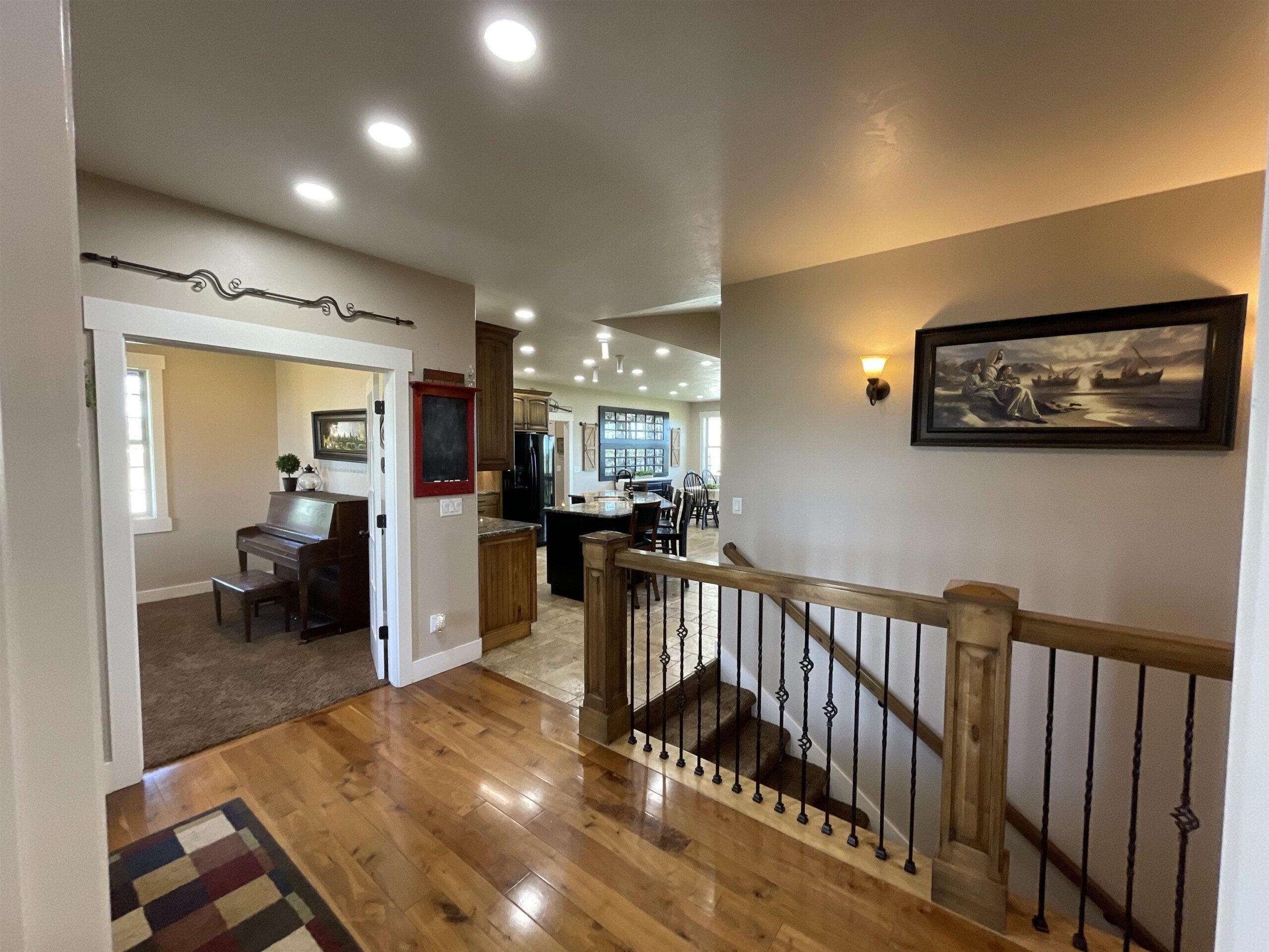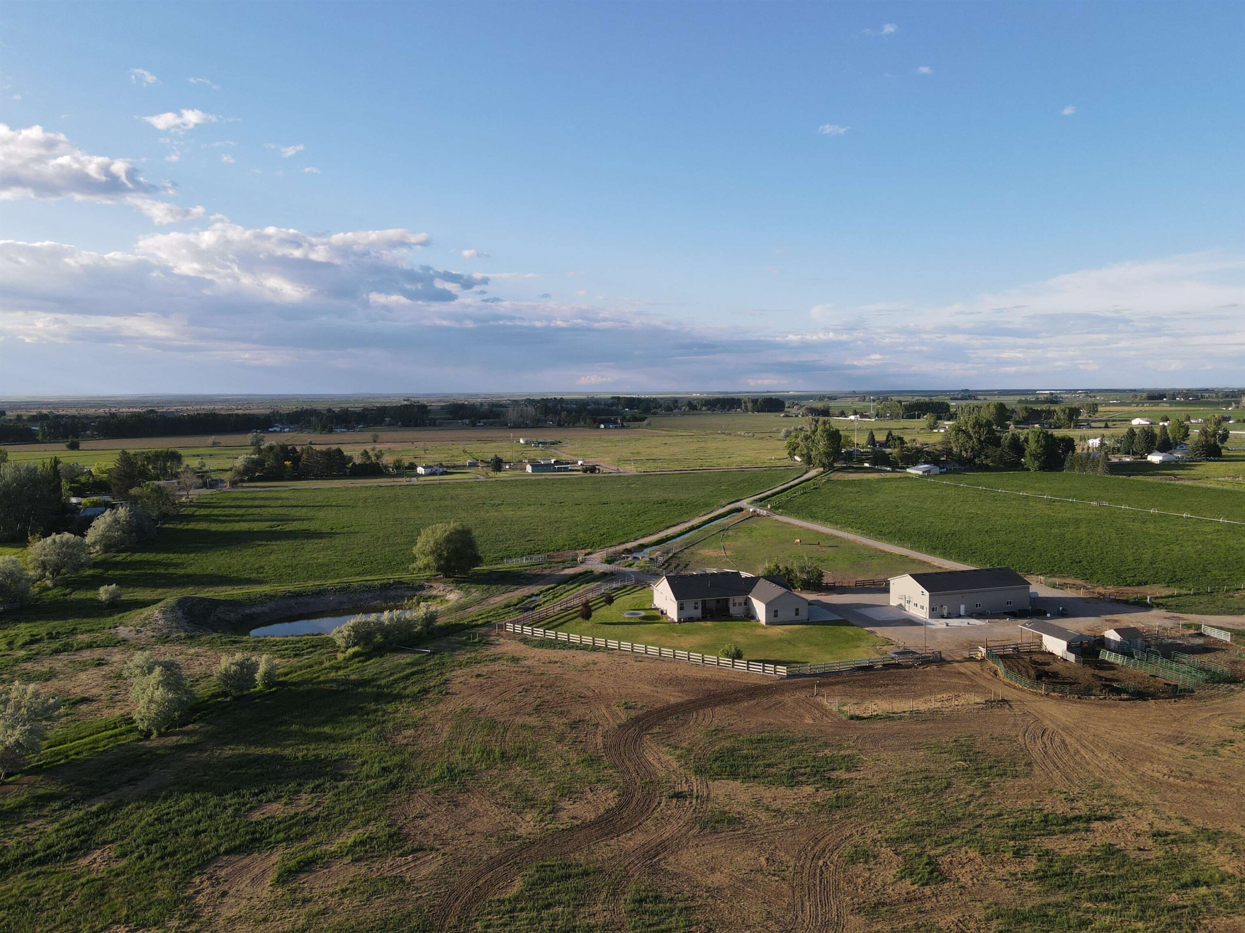 Gorgeous country home on 33.81 sprawling acres, perfect for horses, cattle, or a hobby farm! The main level features 9-ft ceilings, wood floors, office, front room, vaulted great room with gas fireplace, and an open kitchen with custom cabinets, granite countertops, double oven, island, pantry, and under-cabinet lighting. Enjoy a covered deck off the dining area. The primary suite offers an elevated ceiling, jetted tub, custom shower with dual heads, and dual vanities. A second bedroom and bath complete the main floor. The spacious laundry/mud room includes sink, counters, cabinets, and drinking fountain. Basement offers 3 bedrooms, full bath, family room with kitchenette, and cold storage. Outside: 40×70 insulated 3-bay shop plus salon/office with half bath. Also listed with 8 acres (MLS 580669).