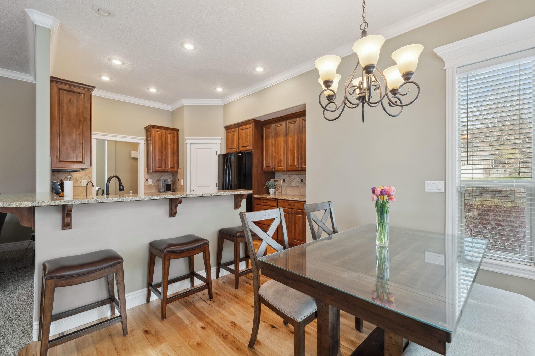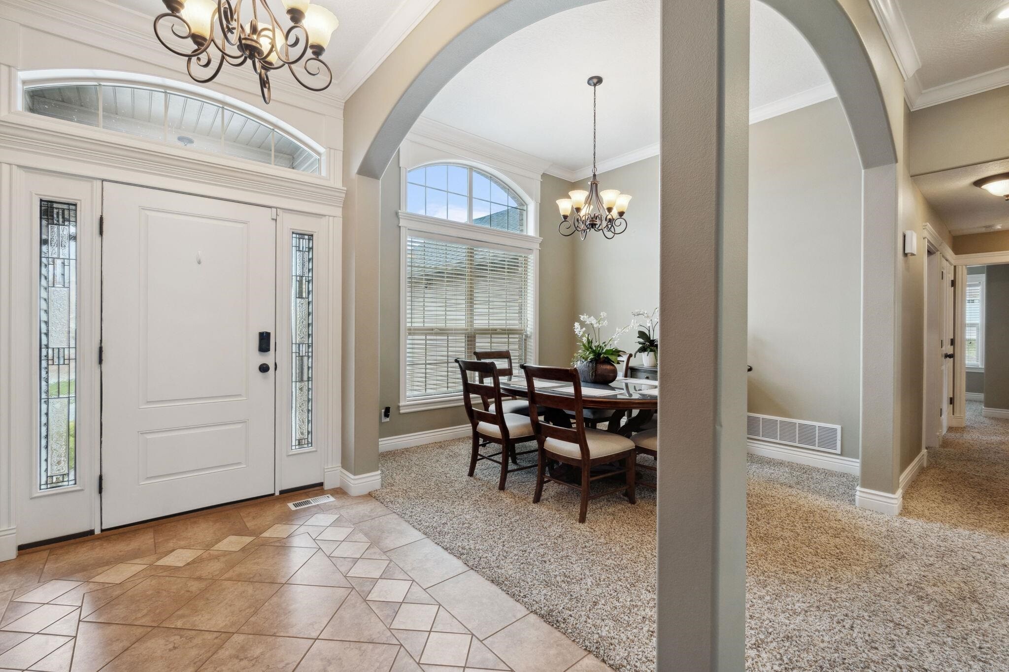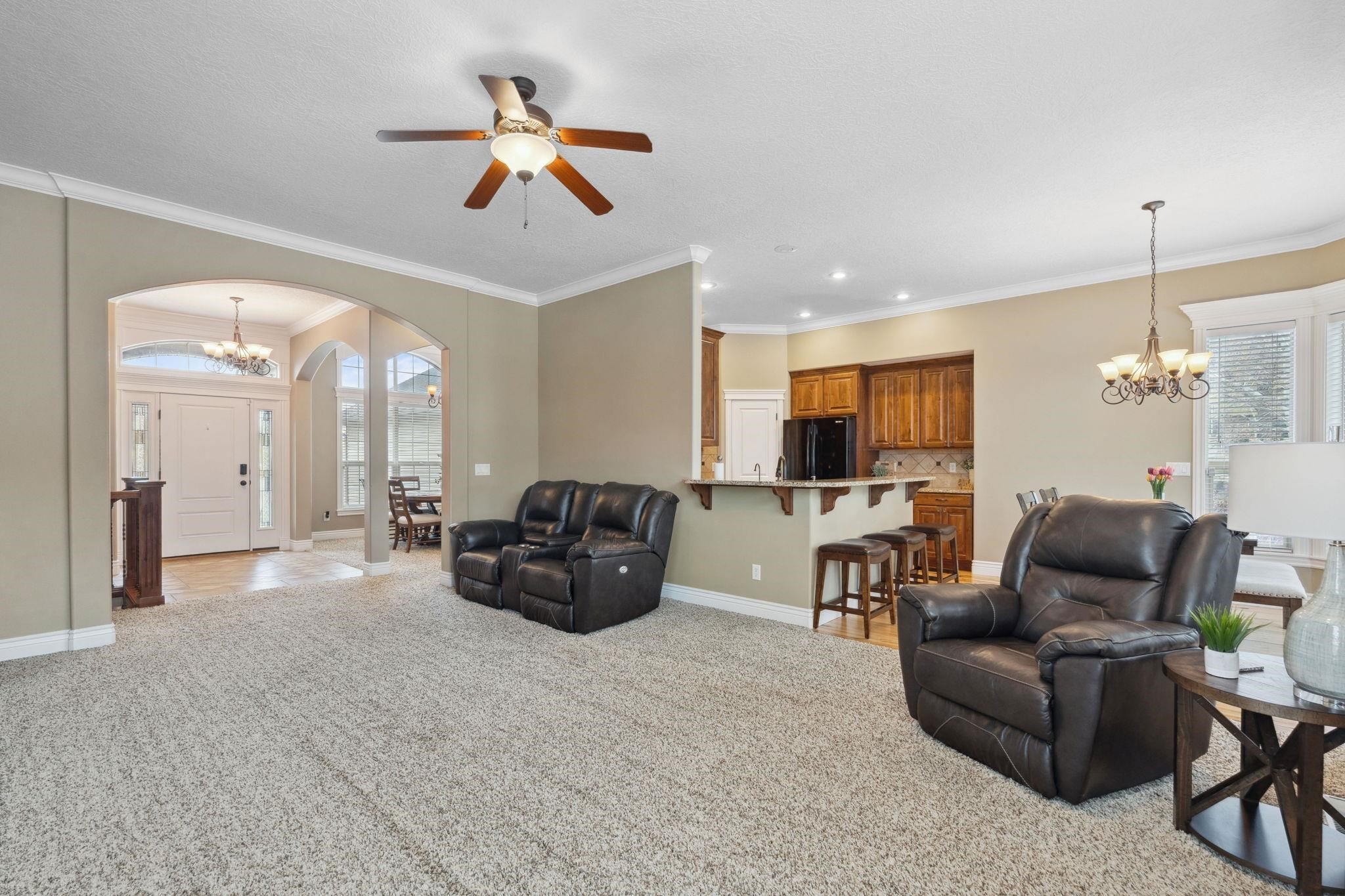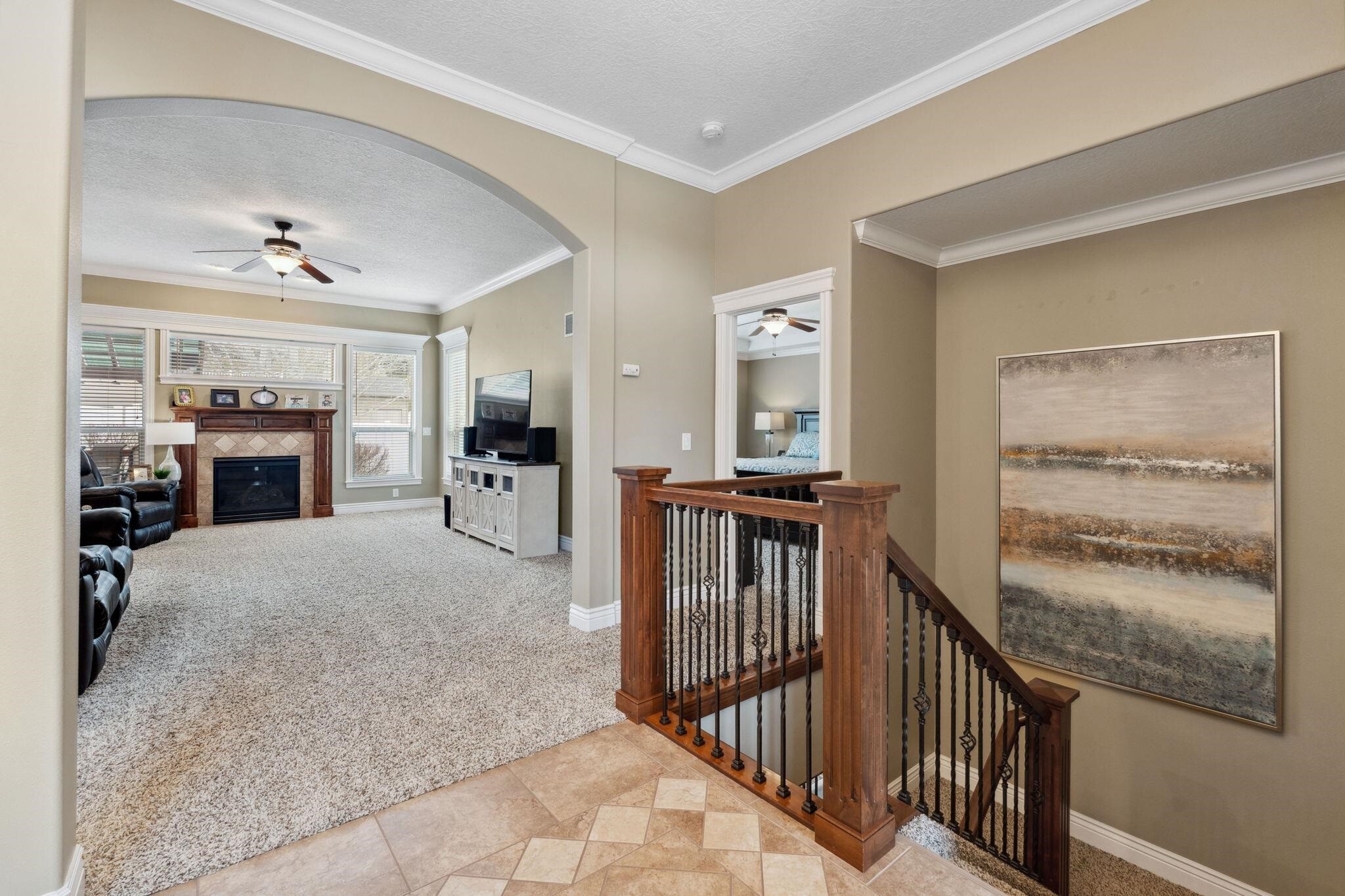 Welcome home! Curb appeal will lead you in, quality and comfort will make you stay. You are greeted by a beautiful dining room with hardwood floors and arched window, living room with gas fireplace that opens to the kitchen and breakfast area. The split bedroom floor plan features the primary bedroom and en suite to the right and 2 bedrooms, bath land laundry to the left. The basement offers daylight windows, family room and gas fireplace, 3 large bedrooms, storage area, bath and bonus workout or craft room. Oversized 3 garage and location near golf courses, camping, trails, and green way round out this awesome home.